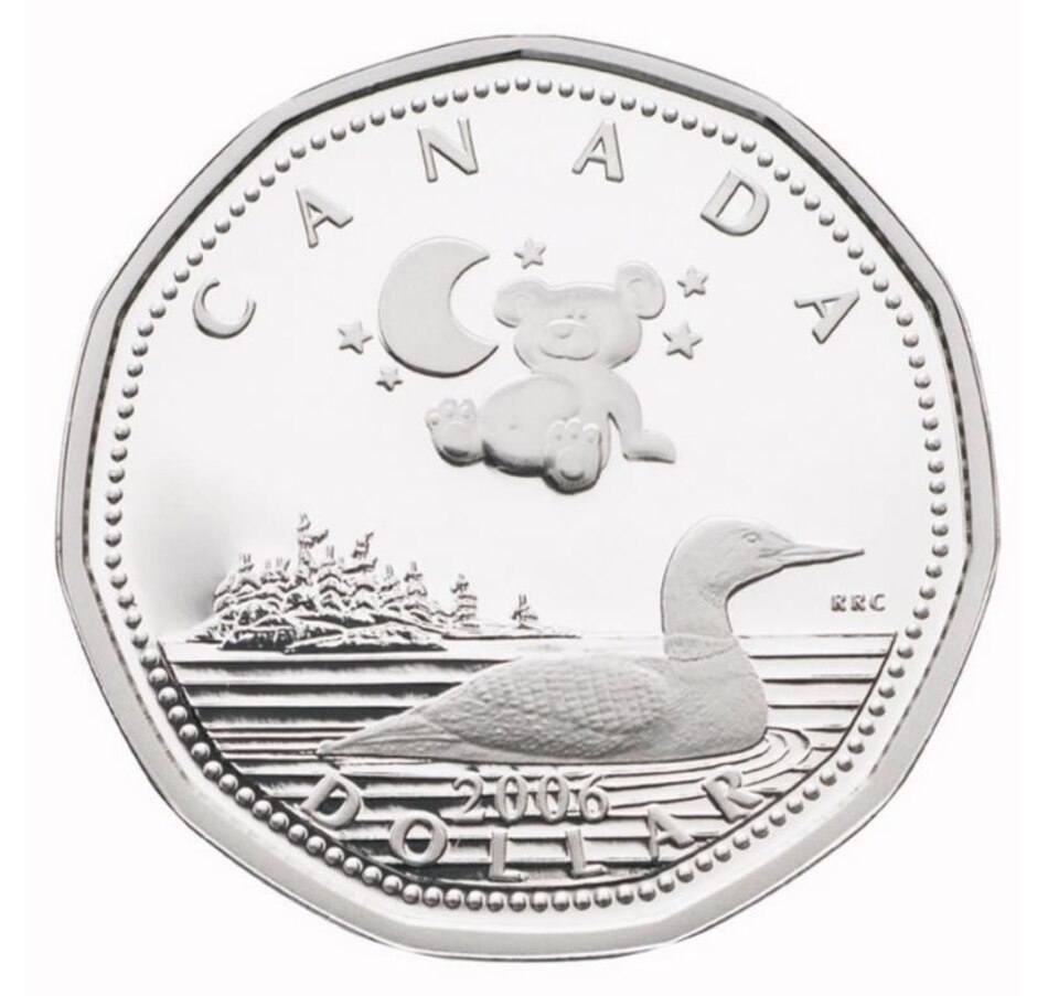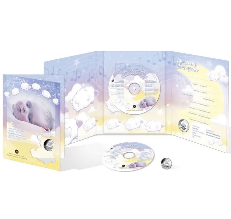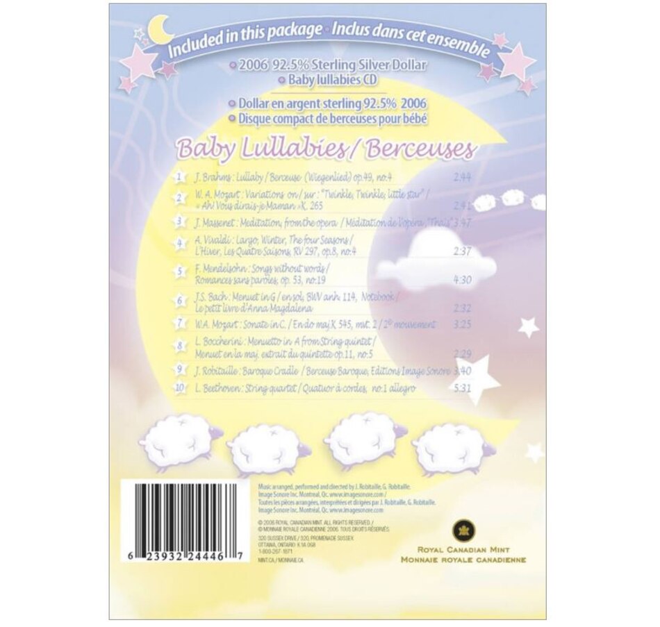 In 2006, the Royal Canadian Mint produced a new sterling-silver dollar designed to mark the birth of a new child. This special-edition version of the coin comes together with a CD of lullabies. Although the Royal Canadian Mint likely anticipated that this would primarily be a gift item, most collectors of Canadian silver dollars are also seeking to add this attractive and likely low mintage coin to their collections. The coin is the absolute best quality produced by the mint: double-struck frosted cameo proof.