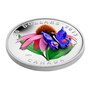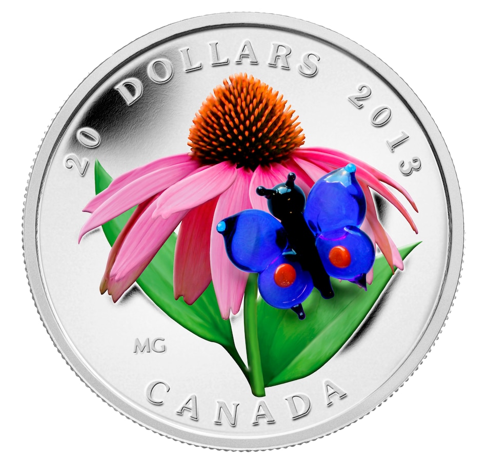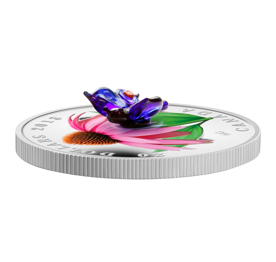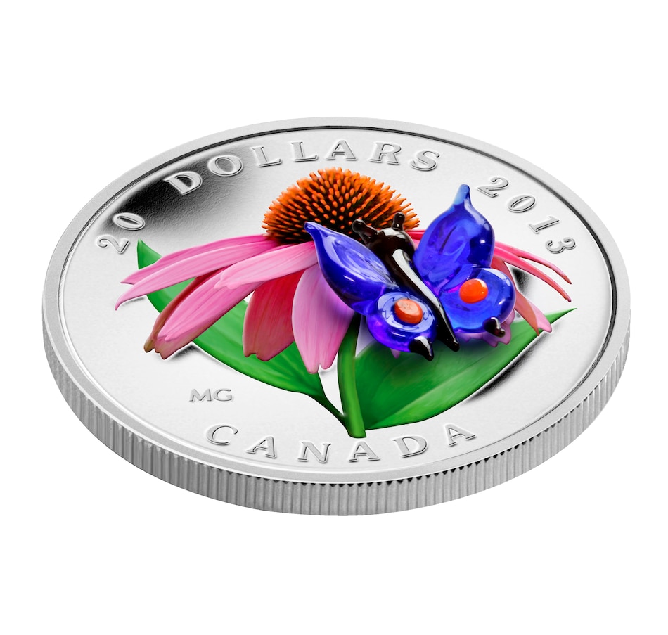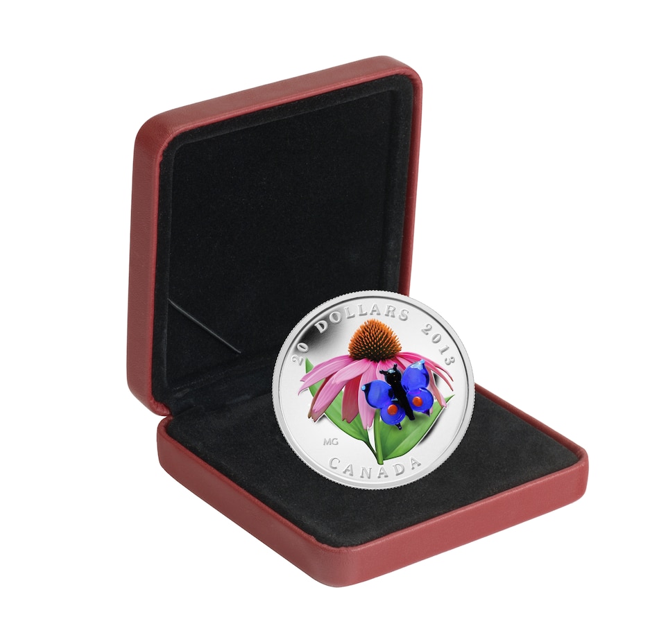 A jewel-like Venetian glass eastern-tailed blue perches on the flower's lower right petals, its dark blue-tinted translucent wings rendered in matchless detail, with their orange dots at the base of each hind wing. This coin makes an excellent collectible for nature lovers, wildflower enthusiasts, conservationists, and lovers of Canadiana.