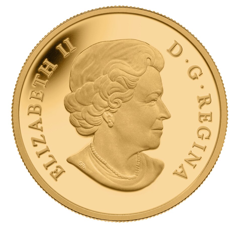 The coin features a unique stylized image, inspired by woodblock design, of an Arctic Fox set against symbolic elements of its Canadian habitat. The fox sits serenely in the foreground of the image, looking toward the left side of the field, its thick fur, fluffy tail, small ears, and dog-like facial features beautifully rendered in stylized detail. In the background, motifs of circles, droplets, and wavy rays rise from the image of a circular sunburst positioned directly behind the fox. The circles and droplets symbolize the snow and light that are fundamental elements in the world of the Arctic fox. The wavy rays allude to the warmth and brilliance of the sun, even in the Arctic landscape. The circularity of these elements echoes the circular field of the coin and hints at the cyclical nature of the Arctic fox's lifecycle. The outer frame is engraved with the species' Latin name, "Vulpes lagopus," the word "CANADA," the date "2013," and the face value of "25 DOLLARS."