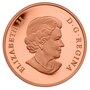 This 2013 bronze proof $3 coin features an iconic rendering of a new Miss Canada allegory for modern-day Canada. Seated on the "throne" of the Canadian Shield, Miss Canada is classically dressed, wearing a crown of maple leaves, her right hand open in a welcoming gesture, and holding a staff in her left. An eagle flies overhead an image of a jumping fish. The base of the image is decorated with a garland composed of more than 25 species of Canadian leaves. The reverse is engraved with the word "CANADA," the date "2013" and the face value of "3 DOLLARS". This is the first bronze collector coin ever produced by the Royal Canadian Mint.