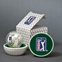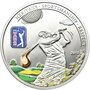 This coin depicts a golfer taking his first shot off the tee using a driver. Selective colour showcases the different green hues of the fairway and rough behind the golfer in the foreground, and is also used for the PGA logo and clouds above. The most striking feature of the coin is a three-dimensional golf ball that looks like it's in motion, heading towards the viewer.