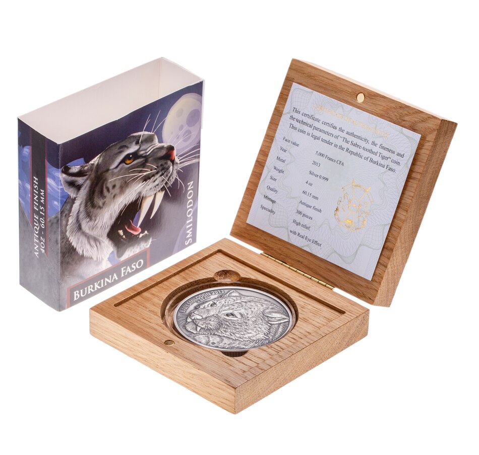• 2013 Baby Smilodon Sabertooth Cat 4 oz Silver Antique Coin