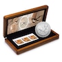 This custom coin and stamp set features an image of a pronghorn antelope gracefully walking. This antelope coin is in near-perfect numismatic uncirculated condition, contains one ounce of pure .9999 silver, and carries a nominal face value of $5. The obverse features the effigy of Queen Elizabeth II. A strip of three new, mint-condition permanent-value Canadian postage stamps are also included, also featuring the pronghorn; they can only be obtained in this set. The coin and stamps are set into a high-quality wooden case, embossed with "Canada." This unique set creates a premium low-mintage collectible or gift item celebrating Canada's history and wildlife; only 1,000 premium sets have been produced.