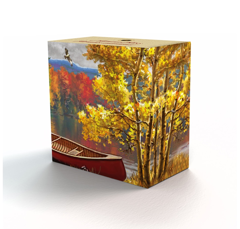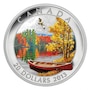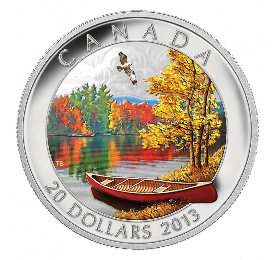 This 2013 $20 pure silver coin issued by the Royal Canadian Mint has been one of the most sought-after of all coins issued in 2013, with the entire mintage selling out in just a few days. The coin combines beautiful art with a low mintage in pure silver to create an extremely popular collectible. The design features a striking autumn scene on a still Canadian lake. In the foreground, a red canoe sits on a shoreline of tall yellow grasses and white late-summer flowers, beside a golden-leaved aspen stand. The canoe floats on the shallows of a still lake, its bow drawing the eye towards the far (or opposite) shoreline. This distant shore is lined with impressionistic pops of bright red, green and yellow that are reflected in the lake below. On the horizon, indigo mountains rise toward a cloudy autumn sky. In the sky above the lake, an osprey spreads its wings in flight, a work of exceptional artistry and detail in and of itself.