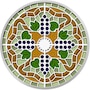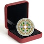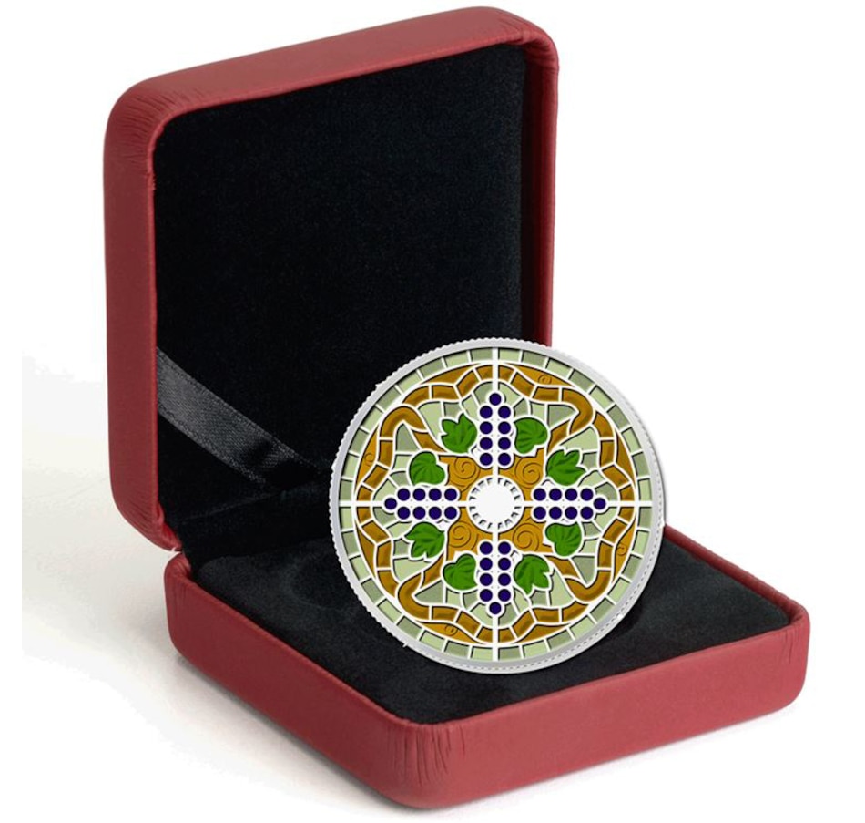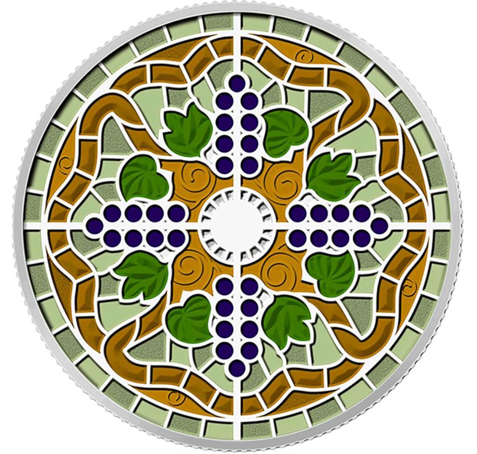 The coin is crafted in honour of the stunning McCausland stained-glass dome in Toronto, Ontario's Casa Loma. At the heart of the disc lies a raised, polished silver circle framed with engraved rays. The image is divided into four quadrants by raised silver lines. Each of the four lines bears a stylized cluster of nine purple grapes. These four clusters are separated from each other by dark green leaves set against a lighter green engraved background. A golden vine encircles the central portion of the image. The outer rim of the image is lined with alternating light green segments.