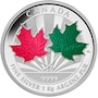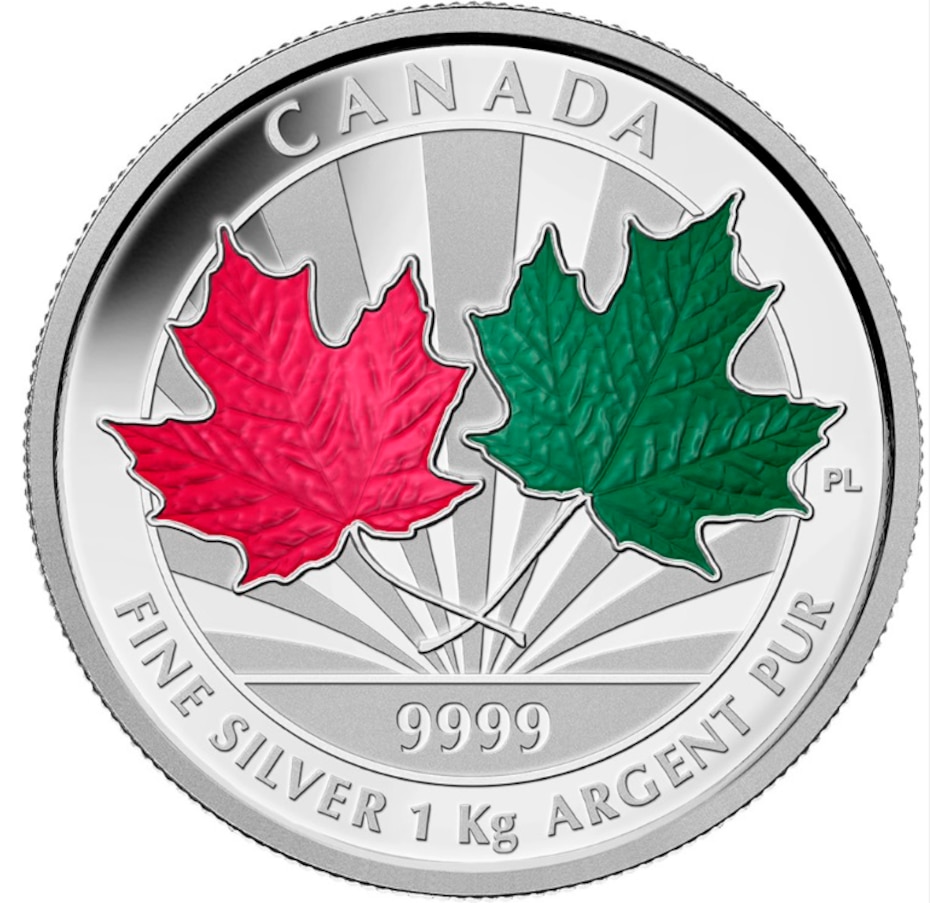 This coin features a beautiful design of two maple leaves selectively enamelled in red and green to reflect the ever-changing beauty of Canada's national symbol through the seasons with rays of sunshine in the background accented with matte and brilliant finishes. This is the third one-kilo coin to be enhanced with coloured enamel!