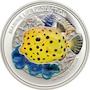 A deep blue giant clam, colourful Christmas tree worms, and scarlet cleaner shrimps complete the miniature reef ecosystem portrayed on this coin. Although they release a deadly toxin, boxfish are actually very peaceful. They can be found in rocky and coral reefs in the Pacific Ocean, the Indian Ocean, and the southeastern Atlantic Ocean. Adults can sometimes be located in lagoons.