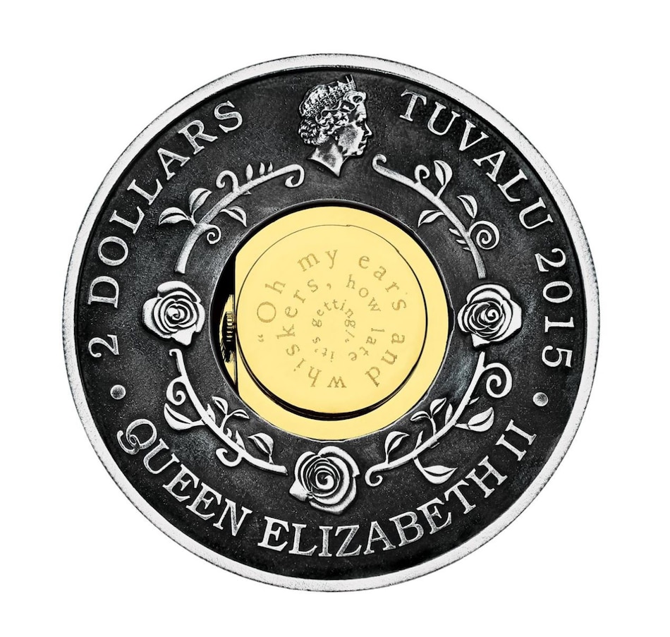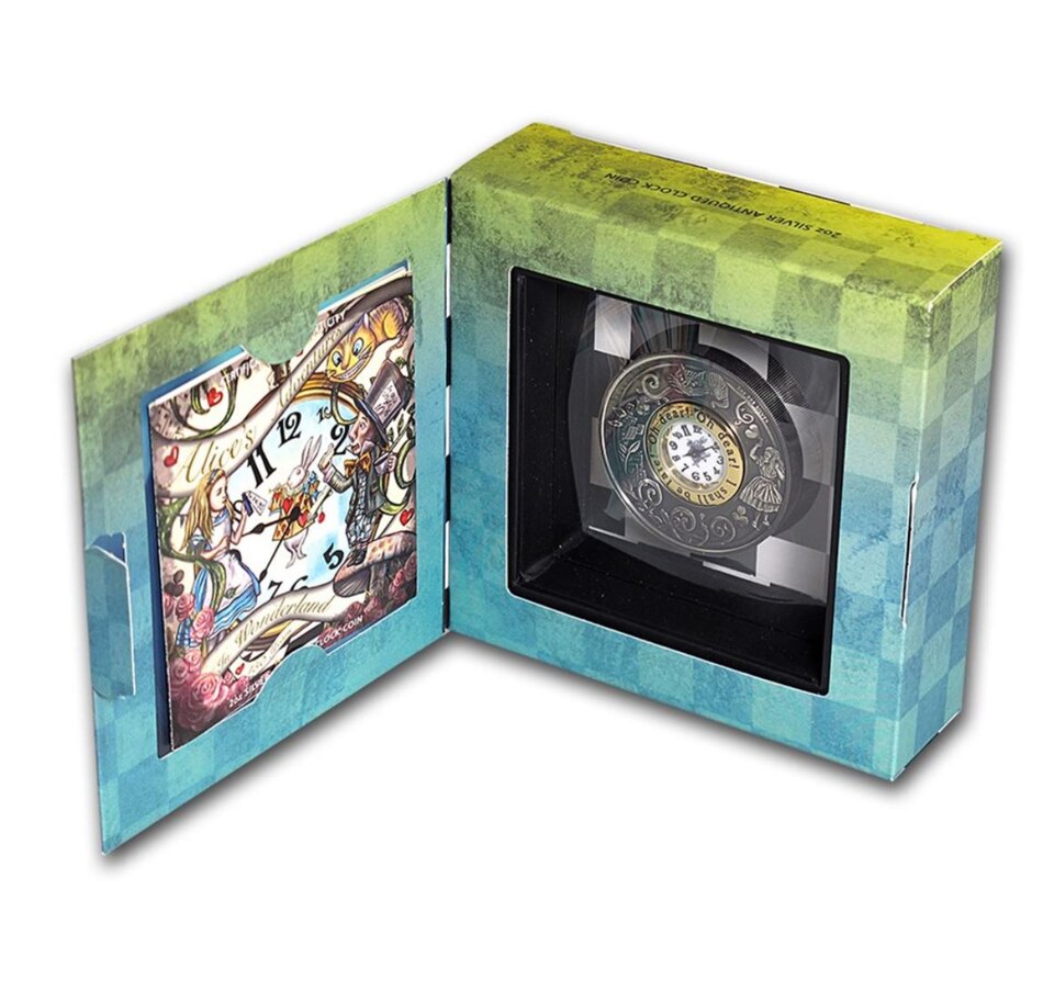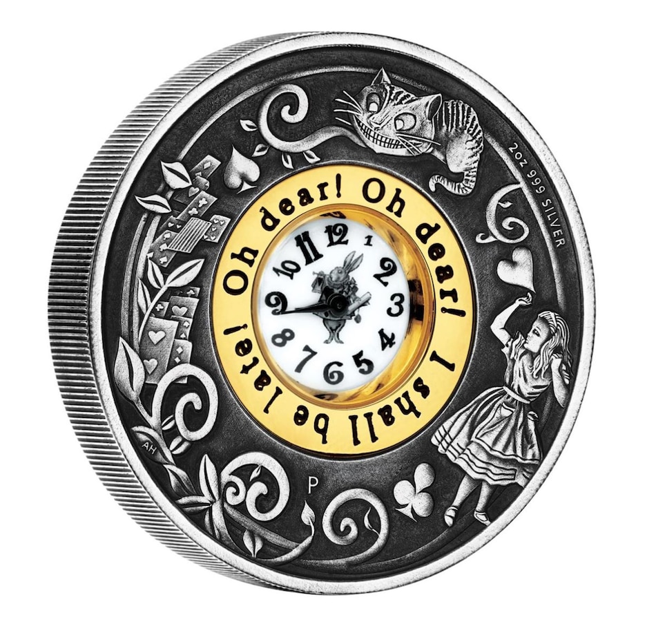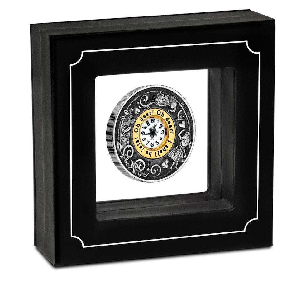 The coin's reverse features Alice, the Cheshire cat, and several playing cards around the edge, with White Rabbit featured on the face of a clock in the middle of the coin. The clock design includes the inscription "Oh dear! Oh dear! I shall be late!" and the Perth Mint's 'P' mintmark. A quote from the book, "Oh my ears and whiskers, how late it's getting!" is also included on the back of the clock in a spiral form.