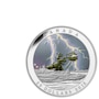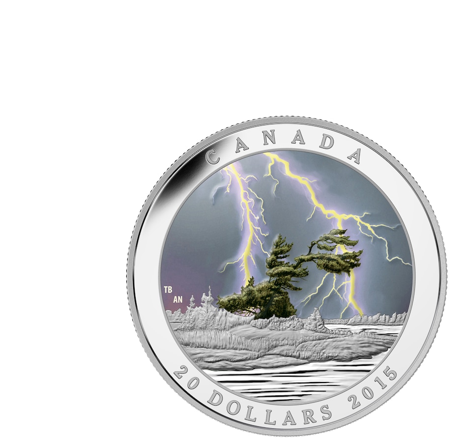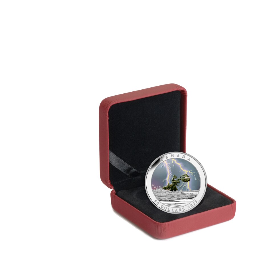 The first coin in the subscription series is called Summer Storm. Through the innovative use of technology, all the power and light of a thunderstorm on a hot summer day blows across this coin's surface, re-creating Mother Nature's most electrifying light show to stunning effect. The design features a lone eastern white pine, shaped by steady winds, rising from a small rocky island in Ontario's Georgian Bay. In the distance, stylized forests cower under a stormy sky that seems to glow with energy as Mother Nature unleashes her power. Viewing the reverse under the black light activates the coin's specialized technology, allowing the lightning bolts to radiate across the sky with a stunning life-like intensity and exceptional luminosity. In nature, there are few displays of raw power that are more spectacular and breathtaking than the sudden flash of a lightning bolt against the dark sky.