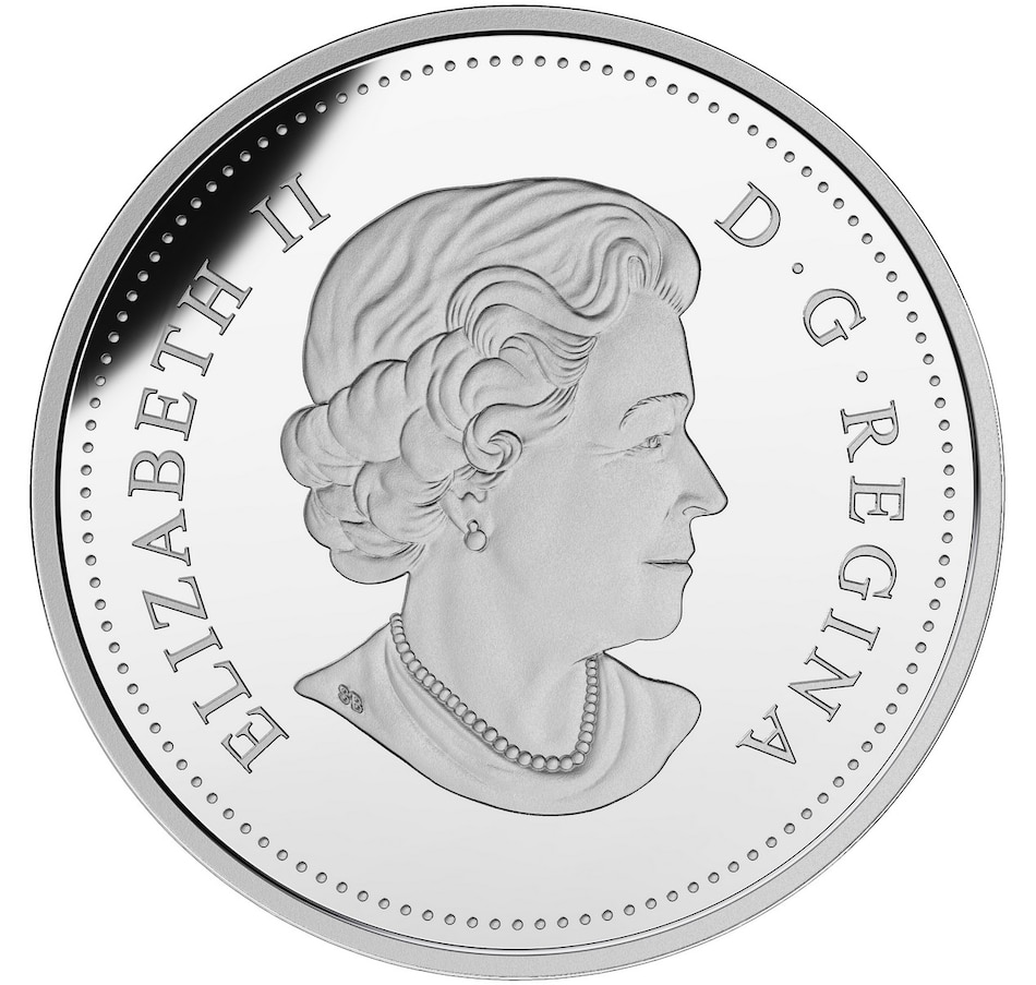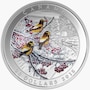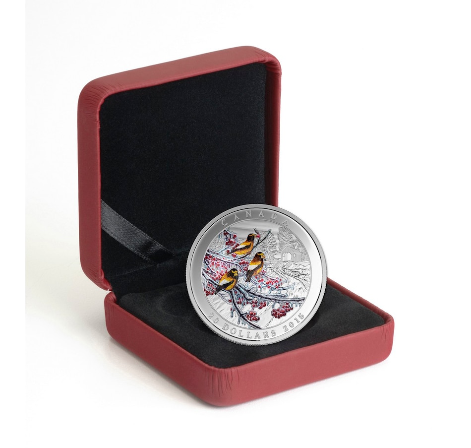 Through the innovative use of technology and colour, this coin presents a snapshot of an icy winter day. The design features three evening grosbeaks as they move along ice-covered branches. With the use of selective colouring, the birds and berries stand out from the countryside in the background. The addition of high-gloss overlay recreates the glistening ice cover of a winter freeze.