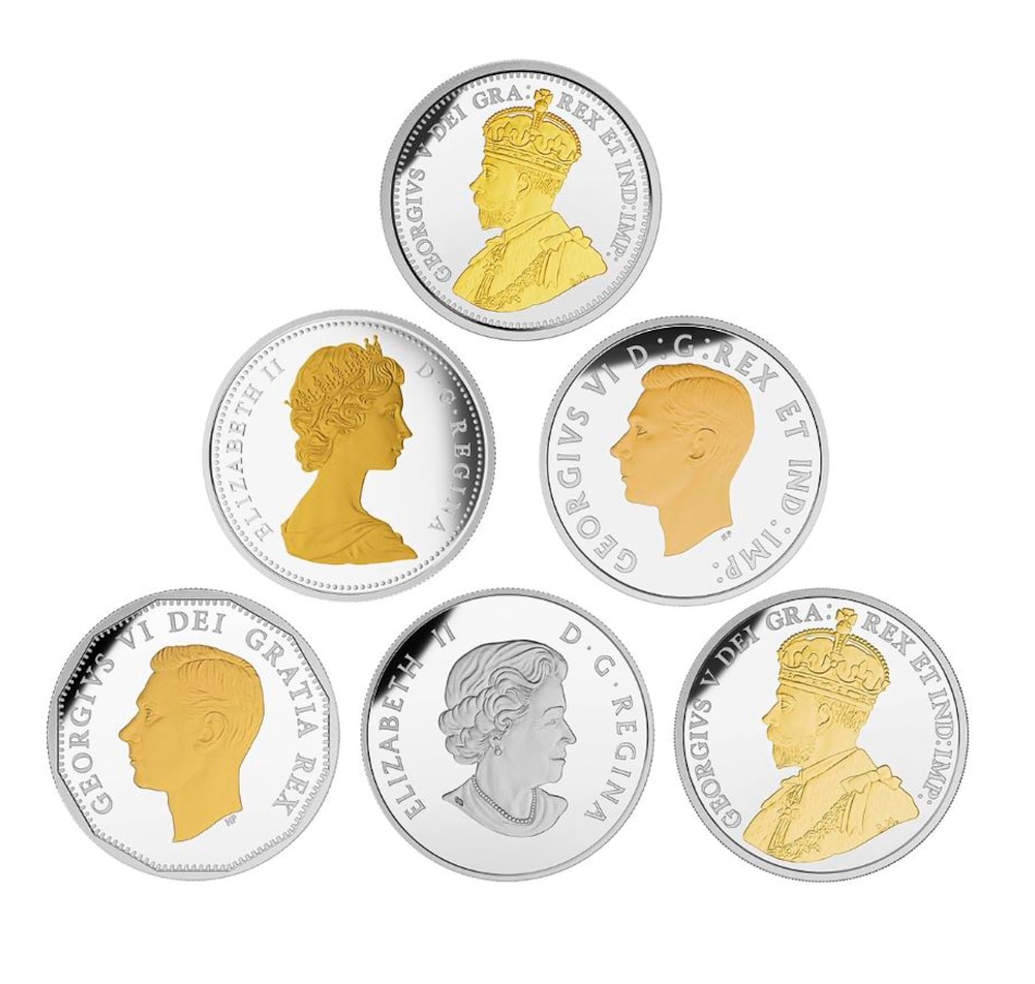 The reverse image features a recreation of William Henry James Blakemore's design, which graced the five-cent coin from 1911 to 1921. Finely detailed engraving and selective gold plating recreate St. Edward's Crown, the solid gold coronation crown, as it appeared on the original coin design. New sculpt and finishes bring added definition to the crossed bough of 22 maple leaves. Featured on the reverse is the effigy of King George V, who was the reigning monarch from 1910 to 1936.