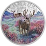 The reverse image by Canadian artist Maurade Baynton features a timeless portrait of an elk. Here, the majestic elk armed with impressive antlers, that give it a stately air, moves through the wilderness with a steady confidant gait, as it browses through the vegetation that sustains it through the seasons.