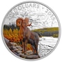 The design features a full-body coloured portrait of a bighorn sheep that captures its grandeur in a picturesque mountain valley setting. With its head turned to the left, the muscular bighorn commands attention as it stands sure-footed atop a rocky ledge. The colour, detail and light in this image bring this majestic animal to life. The brilliant hues of the leaves and landscape add vibrancy and dimension to the background, which is dominated by the Rocky Mountains that tower over the river below.