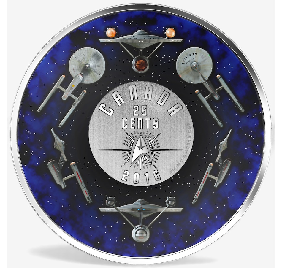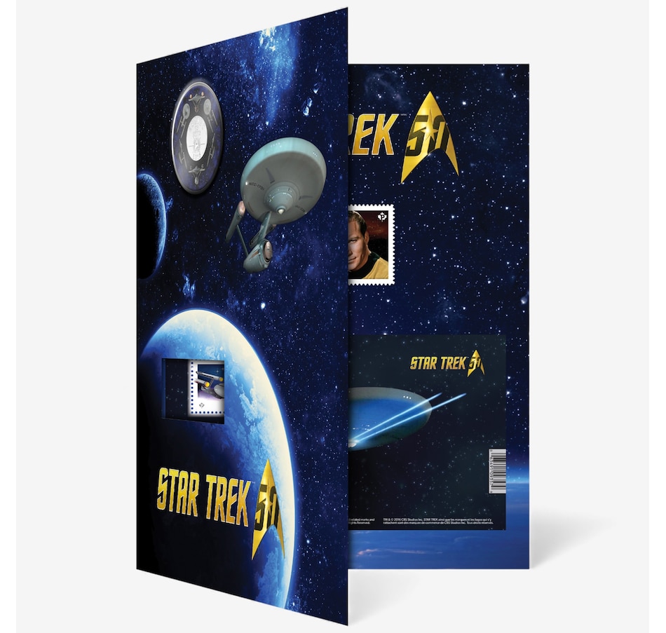 This colour-enhanced large-format 25-cent coin-and-stamp set celebrates the 50th anniversary of the television series Star Trek and pays tribute to one of the most iconic spaceships in science fiction: the U.S.S. Enterprise. The coloured 25-cent coin and three collectible stamps by Canada Post are all presented in commemorative packaging.