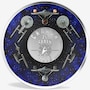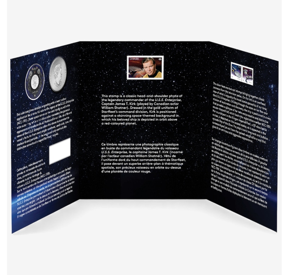 The 35-mm coin design features six different views of the U.S.S. Enterprise in vibrant colour: overhead, underside, bow, aft, starboard and portside. The dark background of this coin gives the viewer a sense of outer space, while the rich blue recreates a nebula cloud. The cover stamp design features a portrait of Captain James Tiberius Kirk in the gold uniform of Starfleet's command division. The background has the U.S.S. Enterprise in orbit over a red planet.