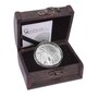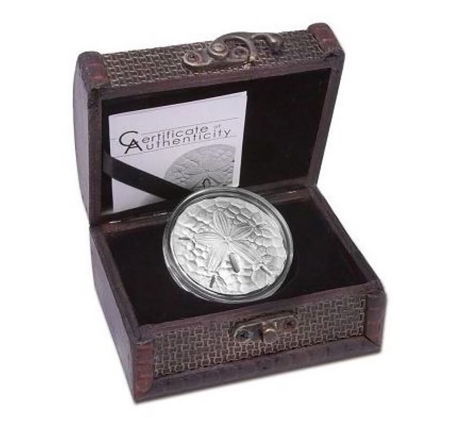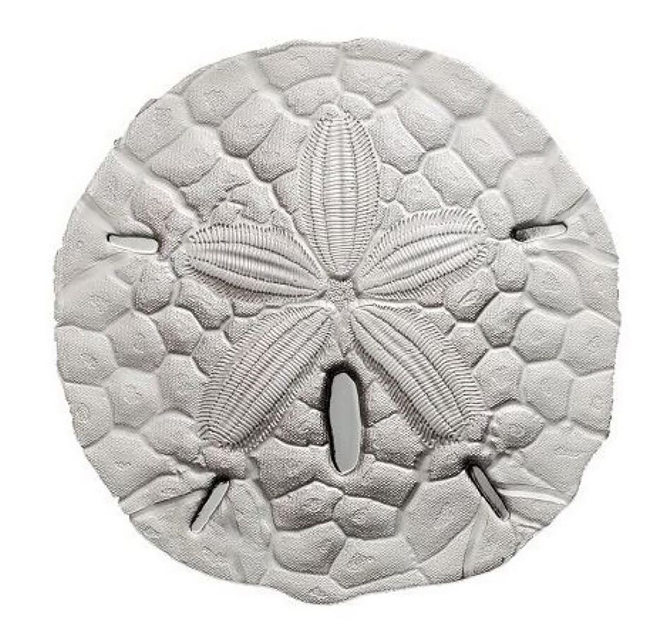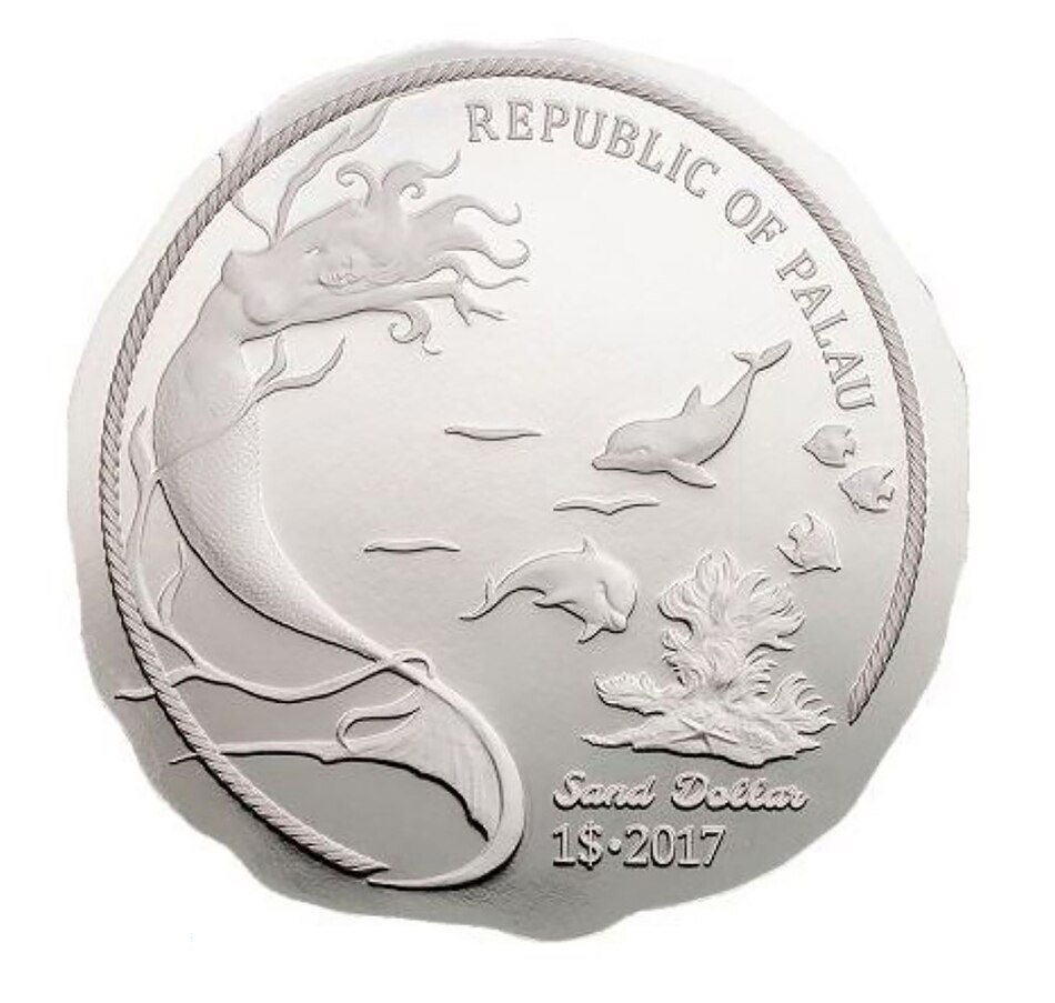 This 2017 one-ounce fine silver coin was issued by Palau. It has an irregular outer shape matching the sand-dollar theme of the coin. Sand dollars are popular souvenirs collected by tourists and beachcombers around the world. The sun-bleached skeletons of these sea urchins resemble old Spanish and American dollar coins, which led early settlers to refer to them as sand dollars. In Spanish speaking countries they are often known as galleta de mar, which means sea biscuit or sea cookie. Some believe sand dollars to be mythical coins lost by mermaids and washed ashore. Still others consider them to be the currency of the people of the lost city of Atlantis.