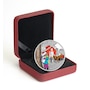 The reverse design by Canadian artist Tony Bianco captures the wonder of a quintessentially Canadian tradition. The engraved scene is set in early spring, when the temperatures slowly climb during the day but fall again after sunset. The application of vibrant colour on the coin adds several focal points along the leafless landscape, which is otherwise dominated by silver and white. A sleigh pulled by a team of horses adds a timeless quality to the setting, as does the bright red sugarhouse nestled in the maple grove, where the sap is boiled to produce pure maple syrup. In the foreground, the eye is naturally drawn towards the bright winter clothing of a young child, who wondrously peers into a bucket and curiously studies the collected sap during their visit to the sugar shack.