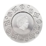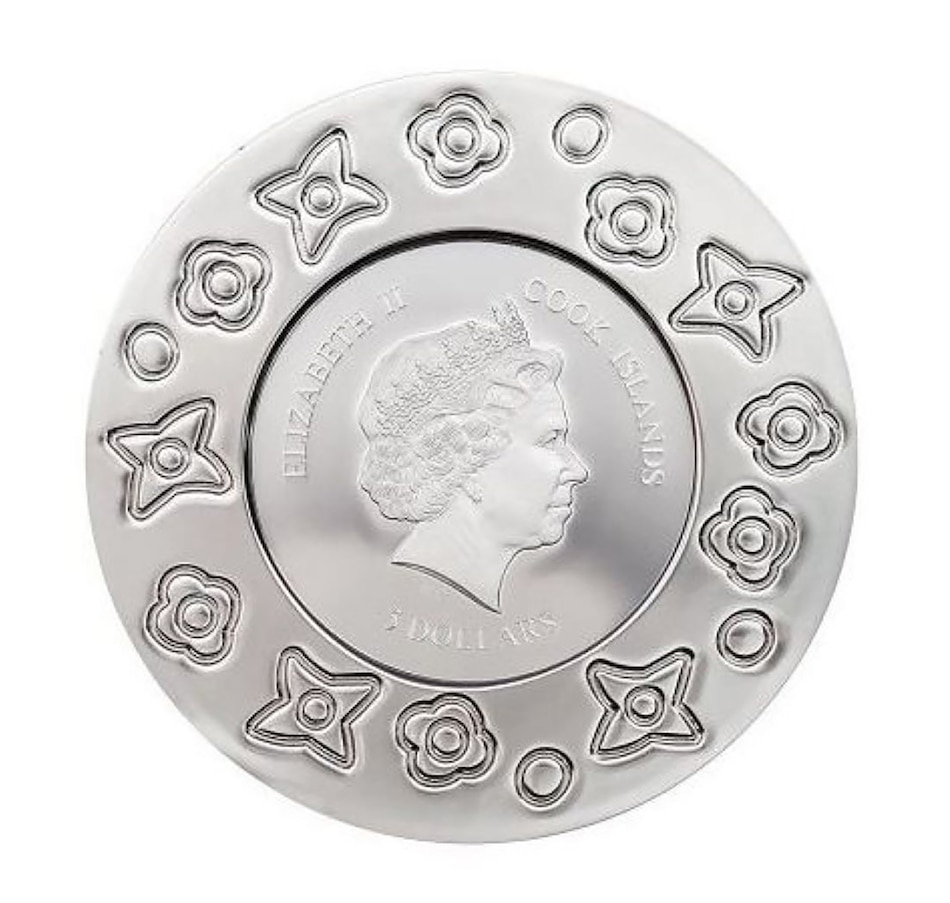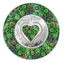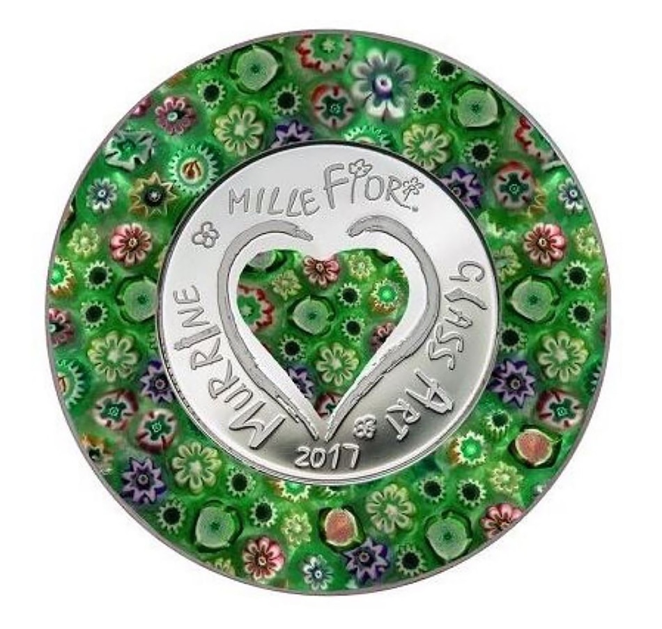 This 2017 $5 coin features murine millefiori glass ring and glass heart in the centre of the coin. These ornaments are set on a lush green background resembling a lively wildflower meadow. The handmade murrine technique results in each of the 999 coins to be unique in flower detail and arrangement. Specifications have remained unchanged since the first issue of this series.