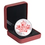 Artist Tami Mayrand presents a symbolic homage to Canada through the classic images that broadly define what it means to be Canadian. Each engraved icon represents a Canadian theme or idea; united by an application of red paint, they form the distinctive silhouette of a predominant Canadian symbol: the maple leaf. Within this pointed outline, the nation's geography, flora and fauna are well represented by various silhouettes, including a mountain peak, small maple leaves, pine cones, an evergreen tree, birds in flight, a wolf, a moose, a polar bear, a squirrel, a sea lion, a bear, a bison, a Canadian Inuit dog, and our national symbol, the beaver. A blade of wheat and a bottle of maple syrup highlight some of Canada's most famous agricultural exports, while a hatchet alludes to the forests that have shaped the nation's history. Inukshuks and a tepee pay tribute to the history and richly varied cultural traditions of Canada's First Nations peoples, while a schooner, whale tail, salmon, and orca are a nod to Canada's coasts.