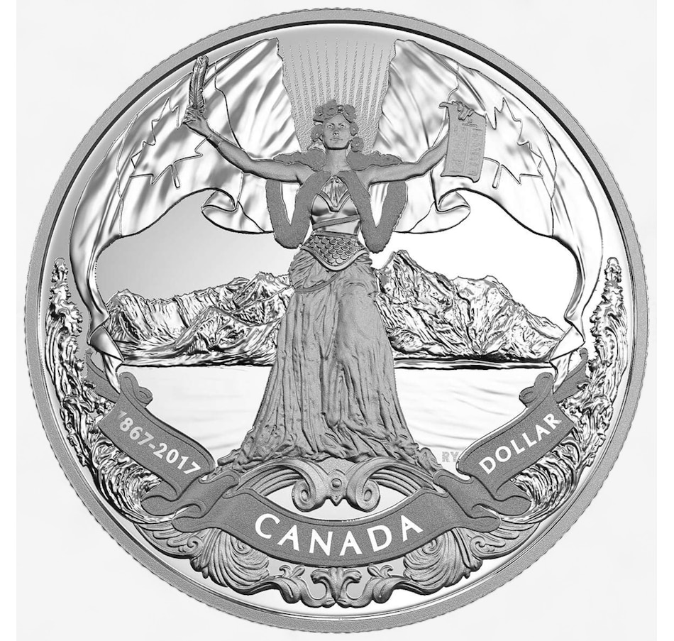 This beautiful 2017 fine silver proof cased dollar coin marks the 150th anniversary of Canadian Confederation and is one of the most significant commemoratives since commemorative dollars first appeared in 1935. The design features a powerful personification of Canada—of its history, its people and its spirit. It is a visual embodiment of a nation celebrating its 150-year journey, while looking ahead to the future.