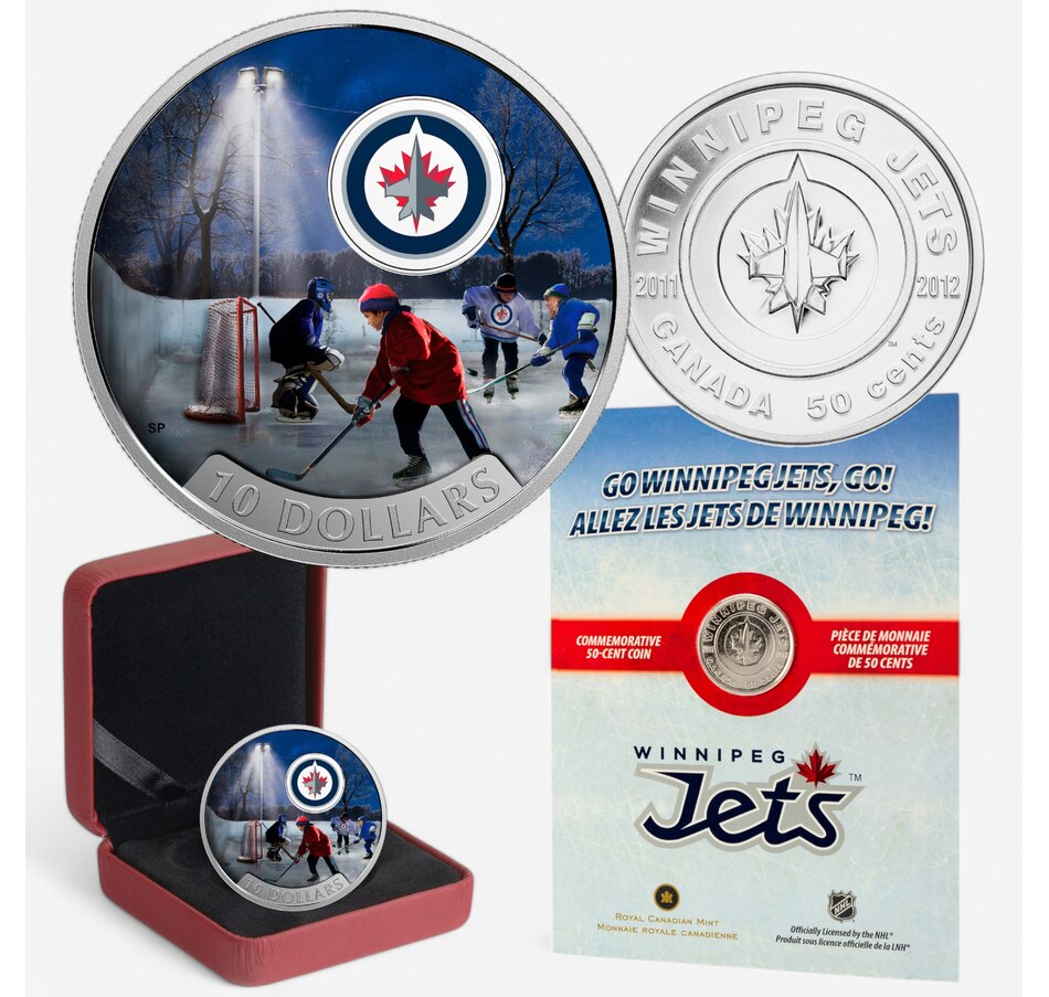 Celebrate the Winnipeg Jets with this two-part set including a 2017 $10 fine silver coin plus a 2011–2012 special collector-issue Winnipeg Jets half-dollar coin. The silver coin is dated 2017 and weighs just over a half-ounce of pure silver.