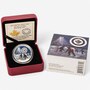 The $10 coin features full colour over an engraved scene, which is set at an outdoor rink in Manitoba. Beneath the overhead lights, four youths share a love for the game as they continue to play into the evening. In the foreground, one player in red skates towards the boards to retrieve the puck, while the two other players on the right are still in position from the last attempt to score. The goaltender stands before the net, somewhat relaxed but with eyes trained on the two players closest to the crease. All four players are proudly wearing the blue, white and red colours of their beloved home team, and above them is the official logo of the Winnipeg Jets, featuring a fighter jet over a maple leaf, all enclosed in a blue roundel.