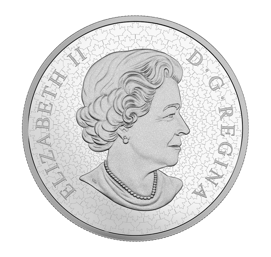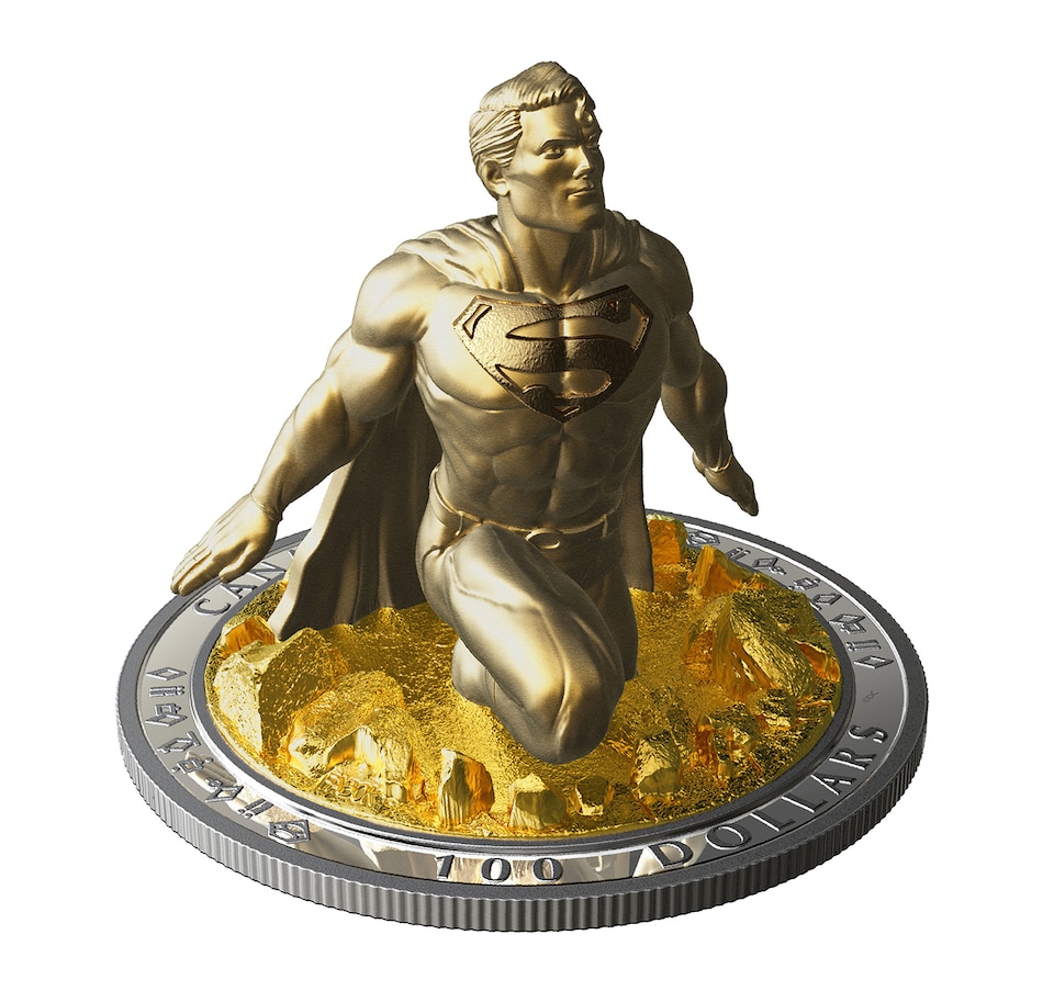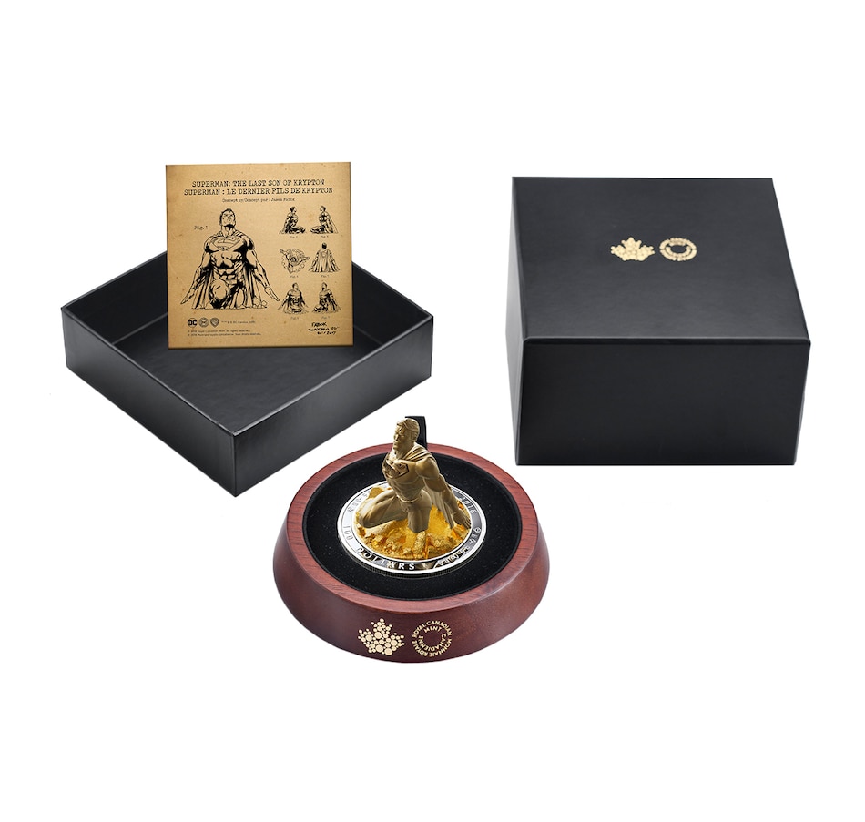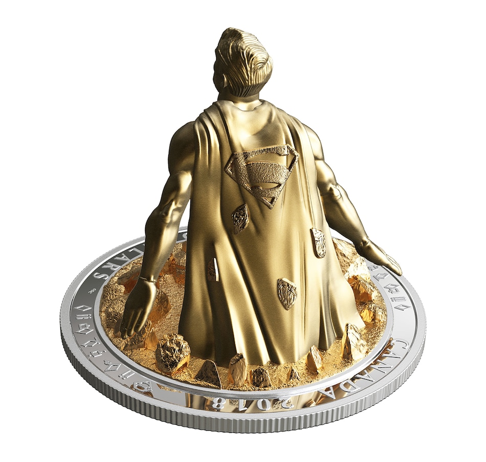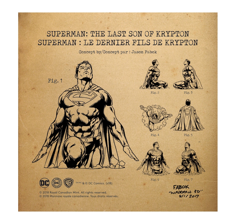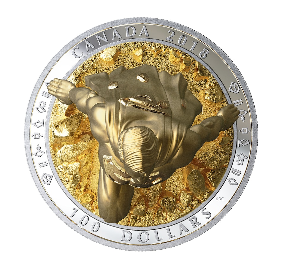 Designed by Canadian comic book artist Jason Fabok, the reverse offers a statuesque take on the last son of Krypton. The silver sculpture of Superman appears to break out of the coin's surface, where the boundary between 2-D and 3-D art has been shattered in a show of strength and resolve. As though exposed to the energy-giving rays of Earth's sun, Superman basks in the rich gleam of gold plating that highlights the sculpted work of Royal Canadian Mint engraver Matthew Porter. Superman's gaze looks up towards the sky as he ascends with arms held out to the side, providing an unfettered view of the iconic "S" emblazoned across his chest. The coin's flat surface serves as a base, where the framed rim includes the engraved Kryptonian glyphs for "Superman" alongside the word "Canada," the year "2018" and the face value "100 dollars." The obverse features an effigy of Her Majesty Queen Elizabeth II by Susanna Blunt and the word "Canada."