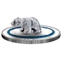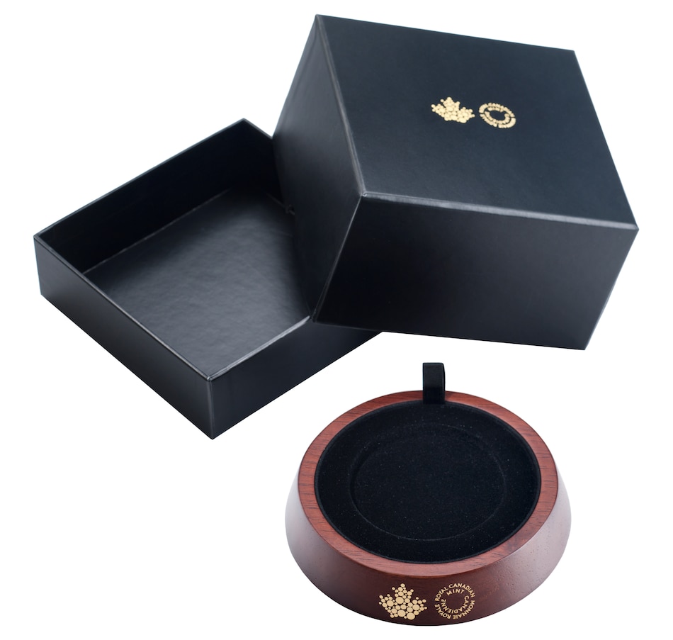 The natural beauty of Northern Canada shines bright on the reverse, thanks to a harmonious mix of finishing techniques and a polar bear soapstone sculpture that makes each coin unique. As it does for Arctic marine life, ice floe provides the foundation for this design: engraving provides a life-like textural effect, while a special frosting gives the snow-covered ice a more matte-like appearance. The surrounding water is a sparkling shade of blue, thanks to the application of translucent enamel over the proof finish. But the focal point is undeniably the sculptured piece that rises up from the ice floe: each polar bear sculpture has been hand-carved from Canadian soapstone by Canadian artist Dave Zachary and his team of sculptors. With its gaze fixed on what lies ahead, the polar bear cuts a formidable figure in this Arctic landscape, where it is regarded as an icon of strength and endurance.