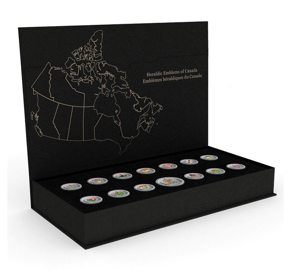 Each emblem is resplendent in colours that have just as much meaning as the symbols or charges that appear on the shield. A unifying design element is the finely engraved flourish on each reverse, which is inspired by the quintessential Canadian symbol: the maple leaf. All of the coins in this set are struck in fine silver, with a total silver weight of about three ounces, and the obverse of each features the effigy of Her Majesty Queen Elizabeth II by Susanna Blunt.