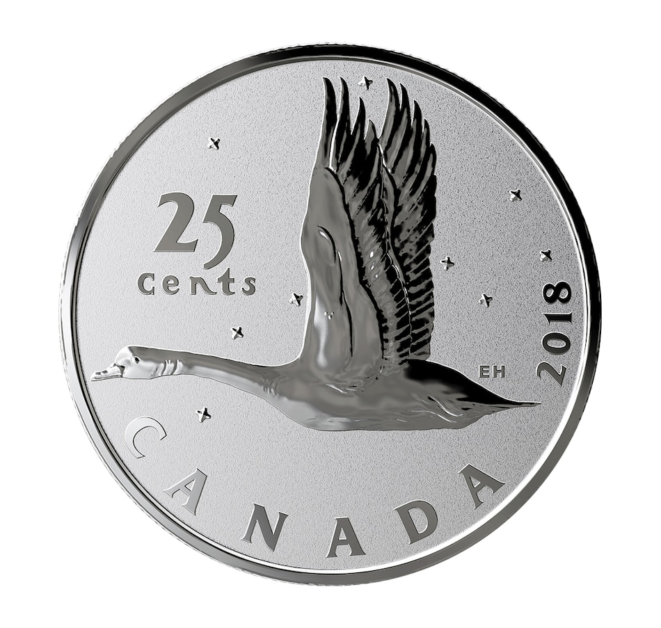 The diamond-like stars are more prominent in the second 25-cent coin design which centres on a goose in flight. The side-profile view allows for the inclusion of several details, including the flight feathers along the outstretched wings. Here again, the Big Dipper adds a point of interest to the field, where the face value "25 cents," the year "2018" and the word "Canada" are also engraved in the starry sky.