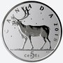 The five-cent coin's reverse has a remarkable tie to the present, as it is Hahn's original precursor to the Caribou image now synonymous with Canada's 25-cent circulation coin. Viewed in side profile, the caribou moves beneath the night sky, where the Big Dipper is clearly visible. The caribou's antlers reach into the legend, where the word "Canada" is engraved alongside the year "2018"; beneath the flat landscape, an oversized "5" winds its way through the word "cents."