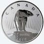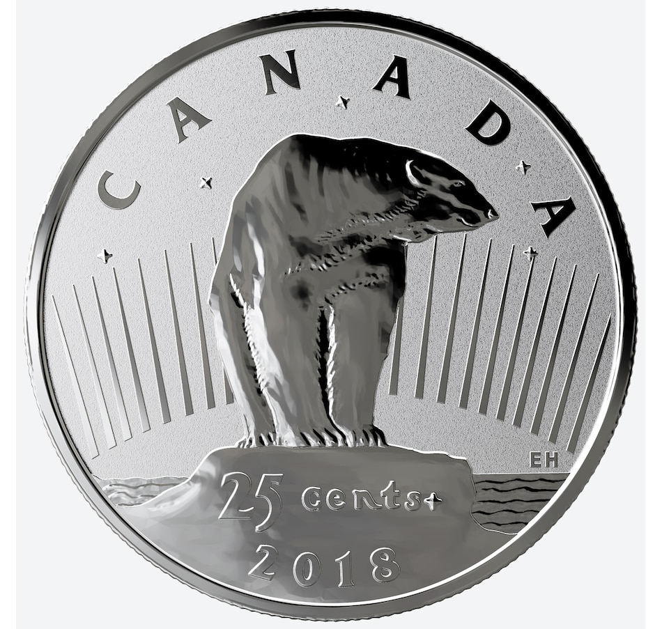 The first 25-cent coin design features a polar bear standing on an ice floe, its head turned toward the right side of the coin, while the open sea is visible behind the mound. A stylistic representation of the aurora borealis hangs over the low horizon and stretches across the northern sky, only yielding to the Big Dipper asterism that is a common element on all three coins. The word "Canada" is engraved at the top while the face value "25 cents" and the updated year "2018" are engraved over the ice.
