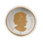The selectively gold-plated reverse features Emanuel Hahn's historic voyageur design, as seen on Canadian dollar coins issued between 1935 and 1986. A canoe traverses the centre of the image; between the paddling voyageur and guide are bundles of wrapped furs and provisions. Wind-swept pines rise up from an islet in the background, while stylized vertical rays represent the aurora borealis in the sky. The canoe, travellers and pines are all gold-plated. The engraved relief includes the words "Canada," "dollar" and an amended date, "2018." The obverse features gold plating along the rim and on the effigy of Her Majesty Queen Elizabeth II by Susanna Blunt.