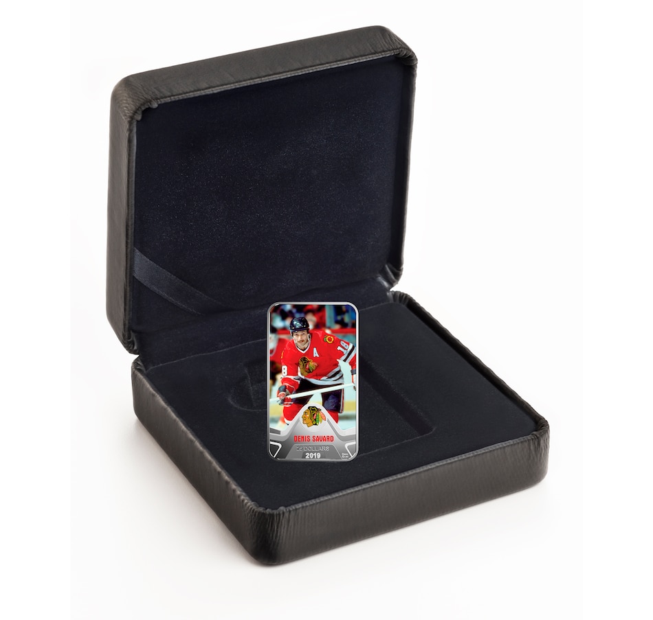 The rectangular reverse features an official licensed photograph from the Hockey Hall of Fame. Reproduced in full colour, the action shot of Denis Savard was taken during his tenure as captain of the Chicago Blackhawks (1988-89). The image of the player from Pointe-Gatineau, Quebec is set within an engraved frame along with the colour logo of the Chicago Blackhawks and the player’s name. The face value of “25 DOLLARS” is also engraved above the year “2019”. The obverse includes the engraved word “CANADA” and features the effigy of Her Majesty Queen Elizabeth II by Susanna Blunt.