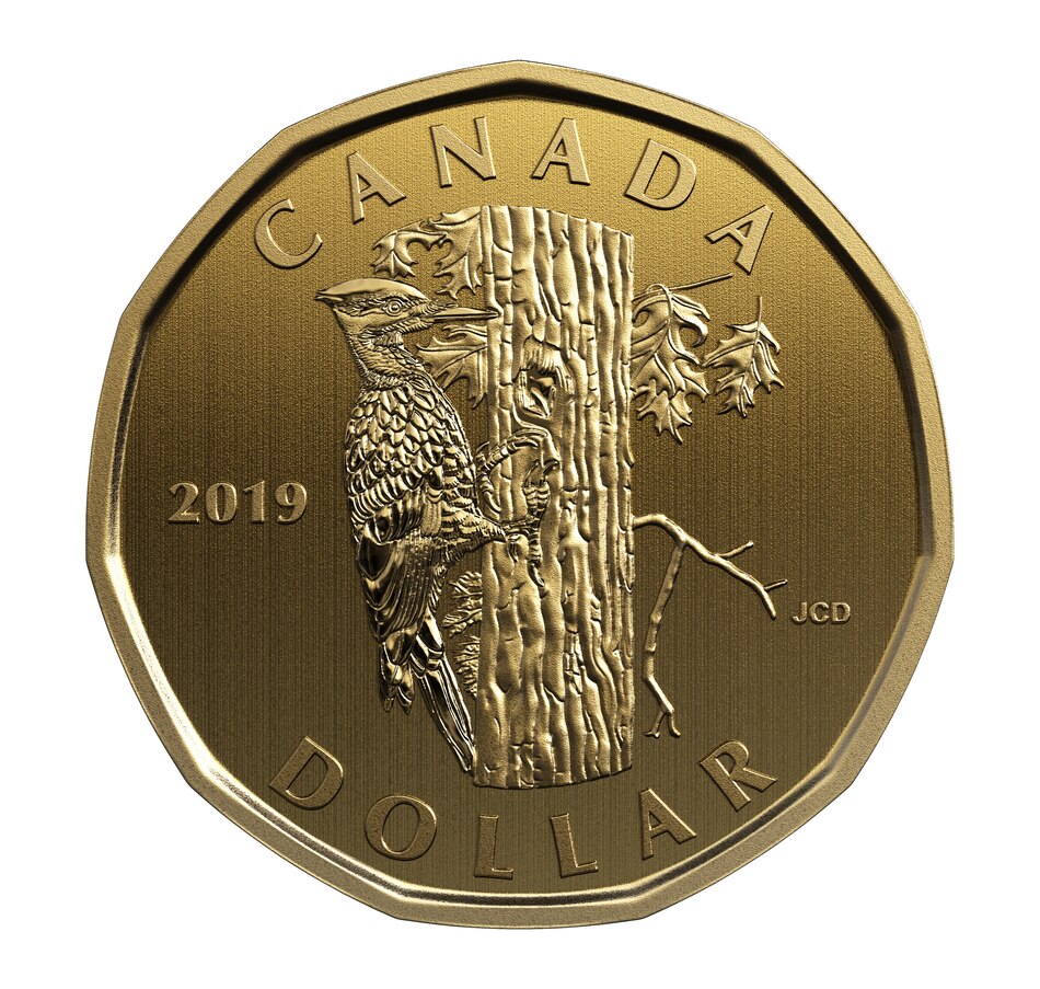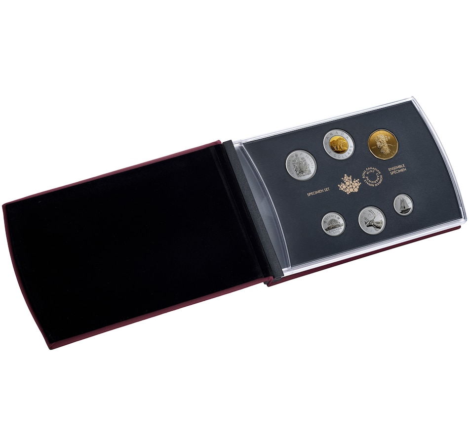 One of the most popular sets of coins produced each year by the Royal Canadian Mint is the Specimen Set. This collection features some of the highest-quality coins struck for collectors, all housed in an elegant book-format presentation. Six denominations from the five-cent coin to two-dollar coin comprise the set, which also includes the elusive low-mintage half-dollar which is not issued for circulation. The highlight of the set is a unique one-dollar coin featuring a pileated woodpecker scaling the trunk of an oak tree, where it uses its bill to excavate an oblong-shaped cavity. This highly collectible coin cannot be found in circulation or in any other coin set. The obverse features the effigy of Her Majesty Queen Elizabeth II by Susanna Blunt.