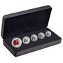 The set features five different sizes and denominations of matched .9999 pure silver coins with a unique O Canada design. The sizes are 1 ounce, 1/2 ounce, 1/4 ounce, 1/10 ounce and 1/20 ounce, and the coins bear a face value of $5, $4, $3, $2 and $1 respectively.