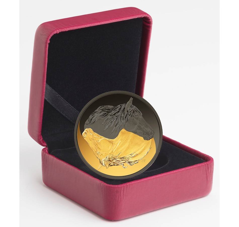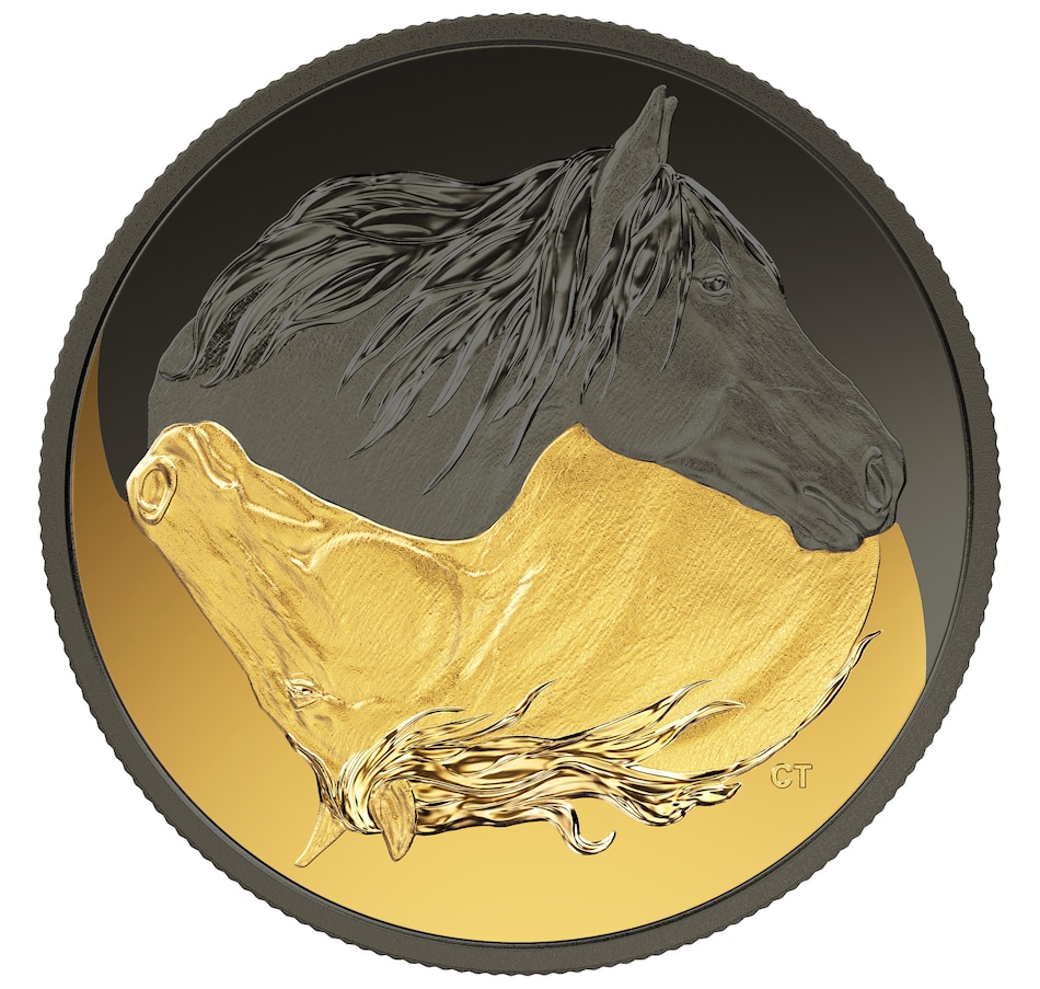 Inspired by the yin-yang symbol, the circular reverse design by Claude Thivierge features two side profiles of the Canadian horse—one plated with gold, the other with black rhodium. The two opposites interact to form a single dynamic image that celebrates the human-horse relationship and reflects on the heritage breed's near-extinction status. The obverse features the effigy of Her Majesty Queen Elizabeth II by Susanna Blunt.