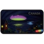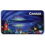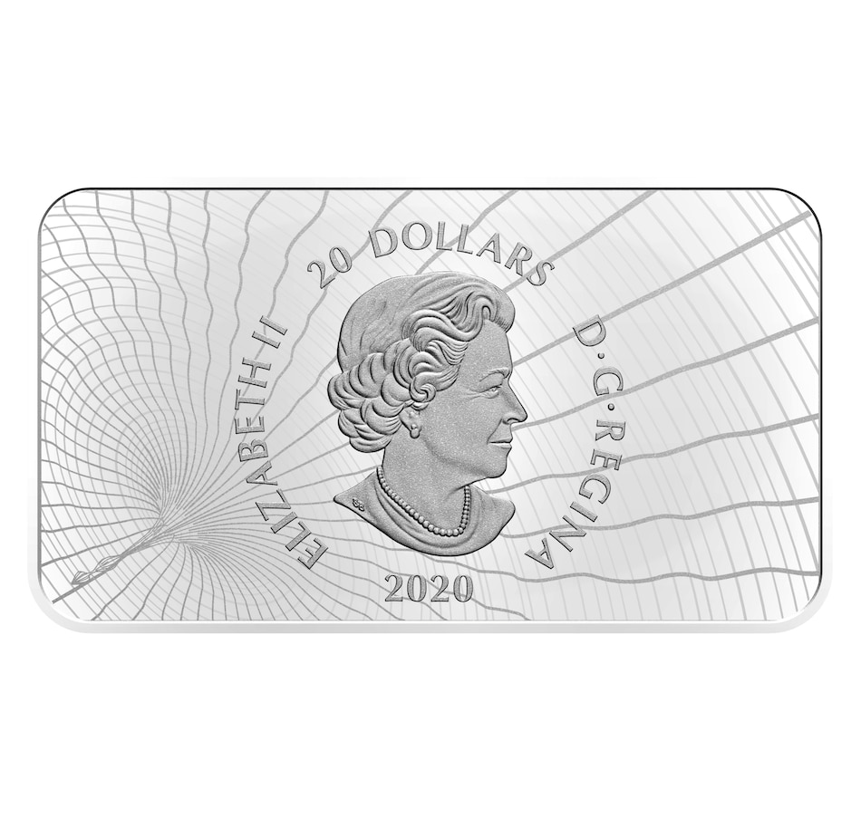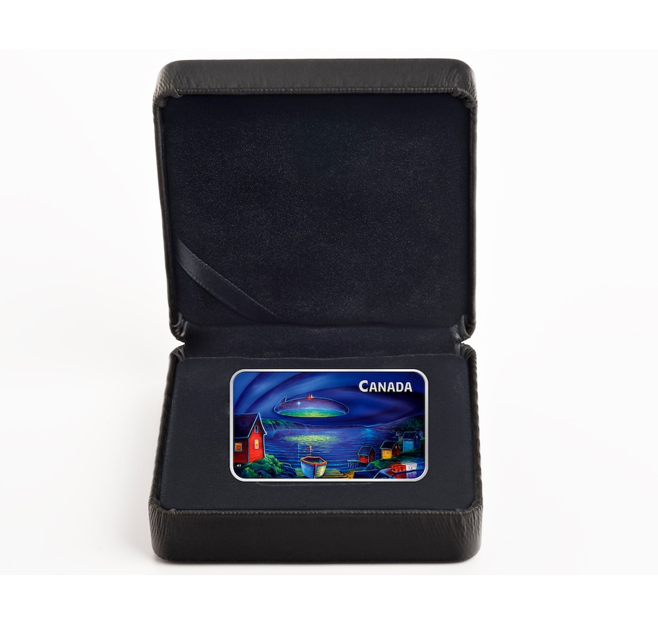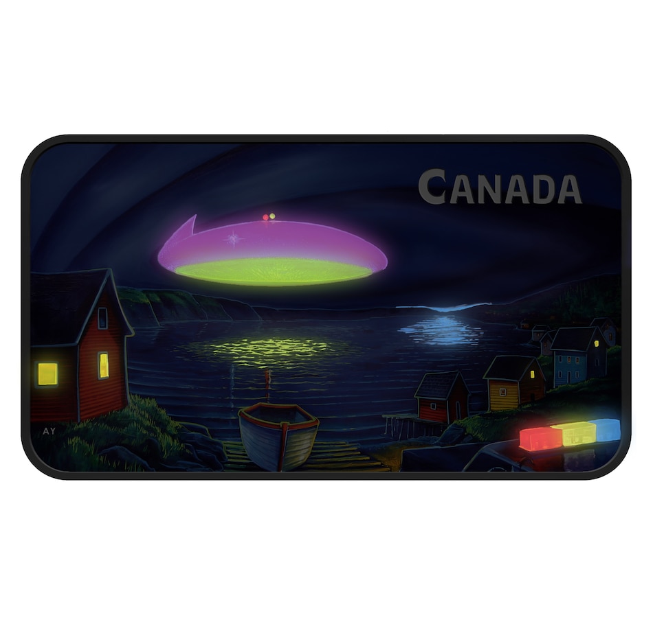 Rendered in a colourful and expressive art style, the landscape-oriented image shows the event from the perspective of the witnesses, including the RCMP officer whose police cruiser appears in the bottom-right corner. The oval-shaped craft is seen hovering over Random Sound on a clear night. Black light-activated technology adds a bright glow to the mysterious object and its illuminated reflection on the water. The obverse features the effigy of Her Majesty Queen Elizabeth II by Susanna Blunt.