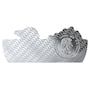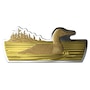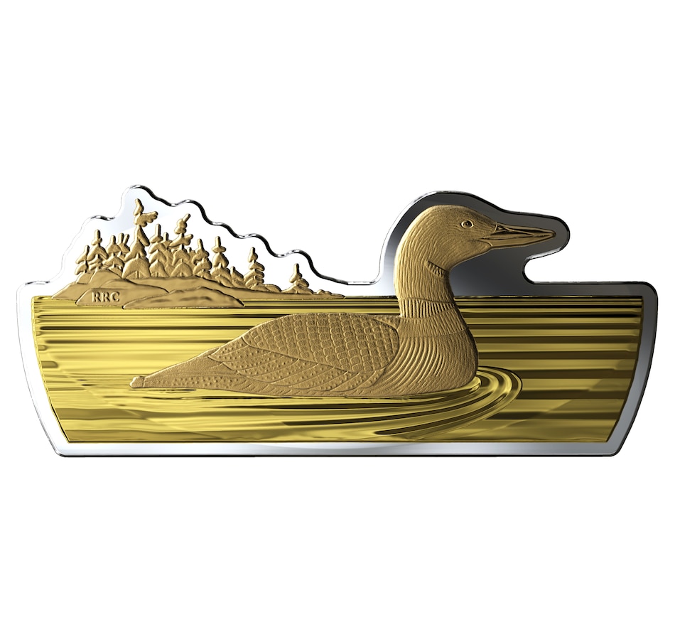 This loon design features the common loon, using the same design as the dollar coin introduced in 1987. However, the loon on this coin is fully shaped and much larger, with a width of about 84 mm and a weight of 100 grams (over three ounces) of fine silver. Robert-Ralph Carmichael's iconic loon floats on a still lake with a small island populated by conifers in the background. The intricate design is selectively plated with 24-karat gold, while the scene is portrayed within its own silver silhouette.