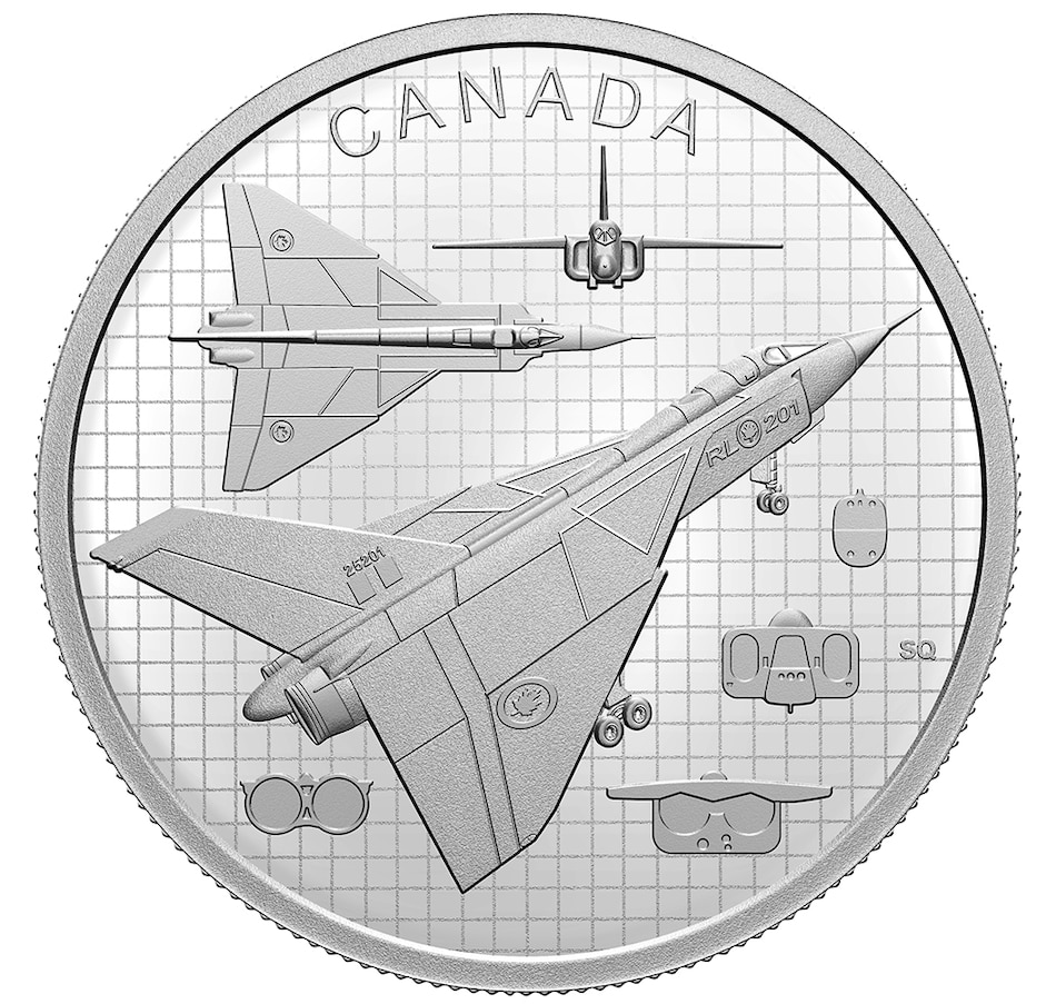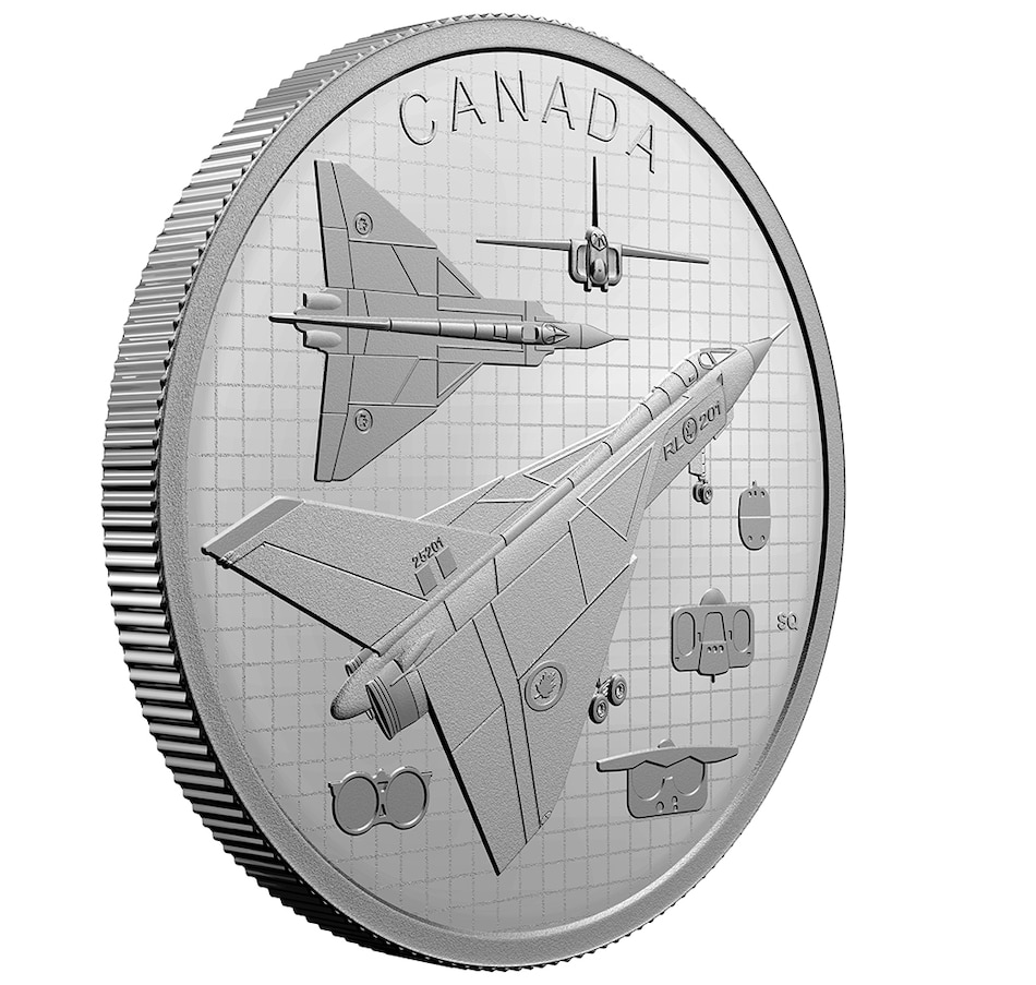 Designed by Canadian artist Stephen Quick, the coin's reverse is inspired by technical drawings of the Avro CF-105 Arrow. It features a mix of cross-sectional plan and three-view drawings, while the rendering of the Arrow in perspective shows the beauty of the aircraft's design. To complete the blueprint look, laser-engraved grid lines fill the field on both the reverse and obverse, which features the effigy of Her Majesty Queen Elizabeth II by Susanna Blunt.