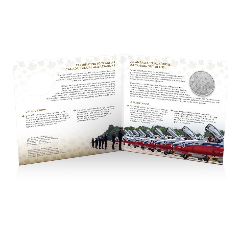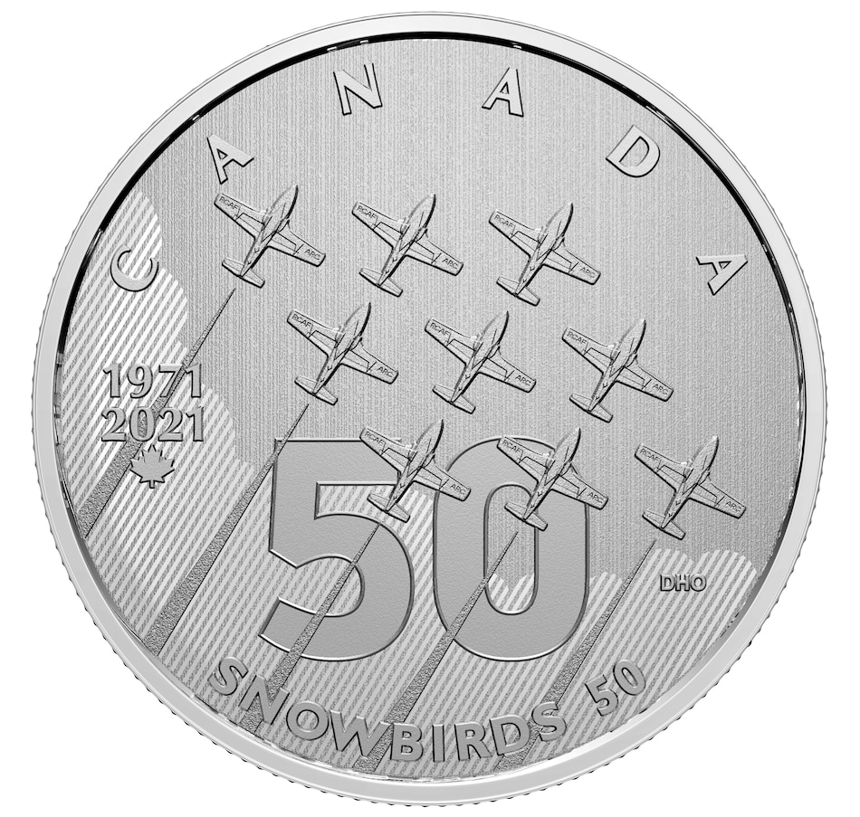 The coin's reverse was designed by Canadian graphic artist Dave O'Malley and features the unique "speedbird" design that has graced the bottom of the Snowbird Tutors since a new paint scheme was introduced in 1974. The obverse features the effigy of Her Majesty Queen Elizabeth II by Susanna Blunt with "Elizabeth II," "D.G. Regina" and "5 dollars" engraved along the outer edge. Historical text and production liaison were provided by former Snowbird commanding officer and team leader Dan Dempsey.