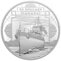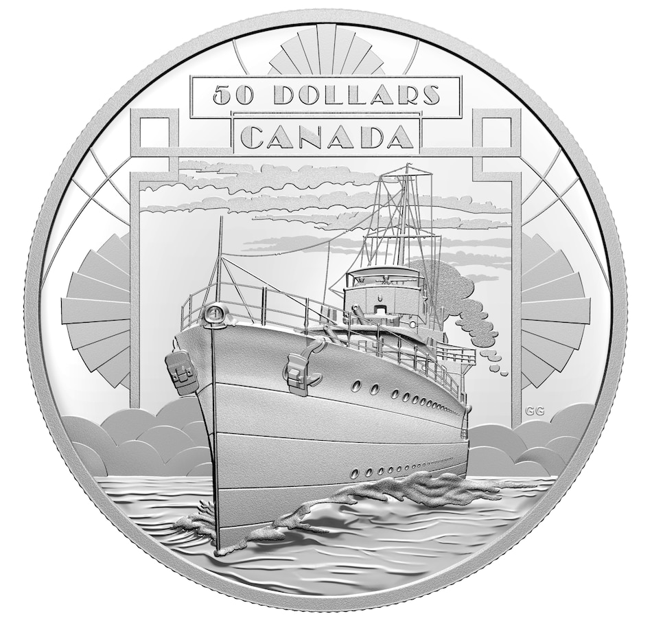 Designed by Canadian artist Glen Green, this coin features a symbol of a Canada's new-found standing on the world stage after the First World War (1914–1918). Art deco elements surround the depiction of HMCS Saguenay; built in 1931, the vessel was one of the first warships built for the Royal Canadian Navy before the naval service's rapid expansion during the Second World War (1939–1945).