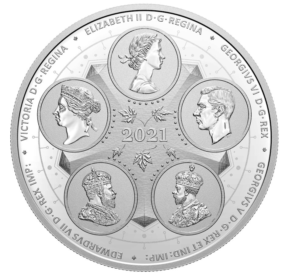The first coin will be shipped with your order, with an additional coin sent every second month as they are released by the Royal Canadian Mint. The obverse of each coin combines five of the effigies that have appeared on Canadian coins since 1867 (clockwise, from top): the first effigy of Her Majesty Queen Elizabeth II by Mary Gillick, the effigy of King George VI by T. H. Paget, the effigy of King George V by Sir E. B. Mackennal, the effigy of King Edward VII by G. W. De Saulles, and the effigy of Queen Victoria by L. C. Wyon.