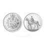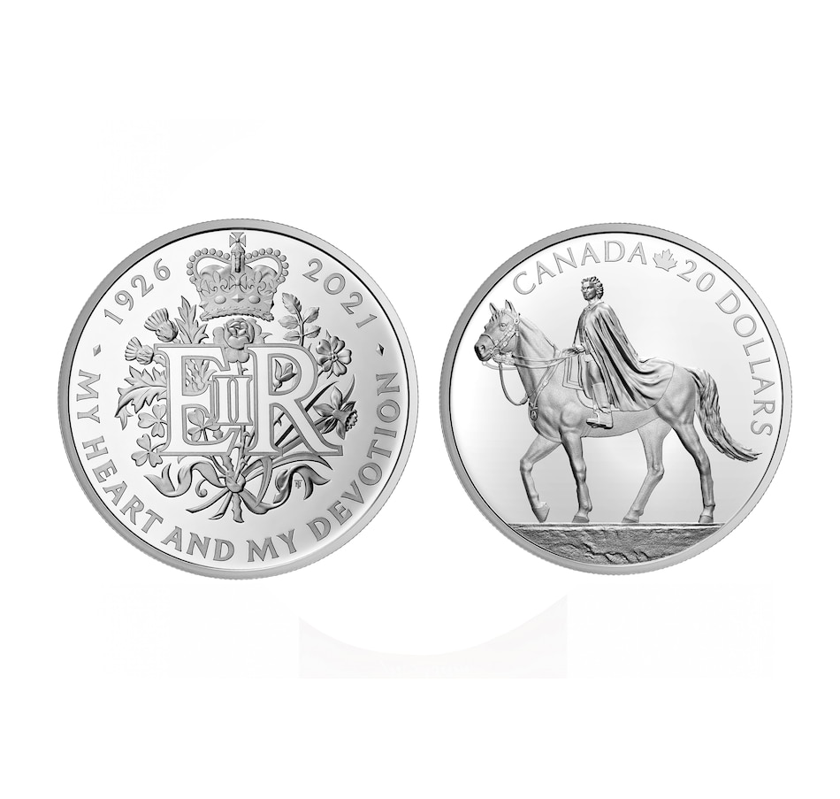The reverse design features The Queen Elizabeth II Equestrian Monument by sculptor Jack Harman (1927–2001). It depicts Her Majesty riding astride her horse, Centennial. The statue was unveiled by Her Majesty on July 1, 1992 on Parliament Hill in Ottawa, Canada. The obverse features ornamental flourishes and the four effigies of Her Majesty that have appeared on Canadian coins since 1953 (clockwise from top): the effigy by Susanna Blunt (2003–present), the 1990–2002 effigy by Dora de Pédery-Hunt, the 1965–1989 effigy by Arnold Machin, and the 1953–1964 effigy by Mary Gillick.