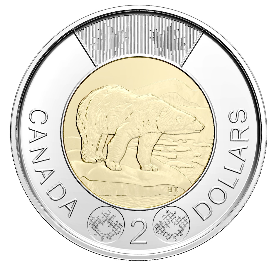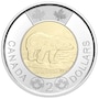 Introduced on February 19, 1996, Canada's bi-metallic two-dollar coin features the polar bear, an Arctic species that is a symbol of strength.