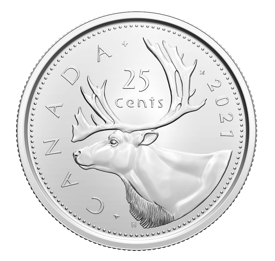The antlered representative of Canada's northern wilderness, the caribou first appeared on the 25-cent coin in 1937.