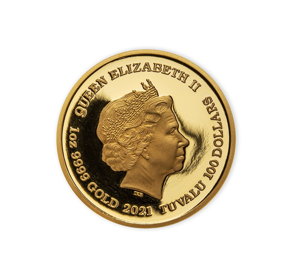 This 2021 $100 one-ounce fine gold coin beautifully combines precious gold and jade, and is meant to bring good luck and fortune to its owner. The coin features an intricately carved genuine jade laughing Buddah set against a rich gold engraved design. The three-dimensional laughing Buddah sits atop a mound of coins against a background of stylized rays of sunlight. Laughing Buddha is considered to be a joyous, more exuberant reincarnation of the famous philosopher and spiritual teacher. Associated with good luck, happiness and abundance in whatever one wishes for, he is a highly revered figure. The obverse of the coin features an effigy of Her Majesty Queen Elizabeth II together with the gold weight and fineness, country of issue, date and denomination.
