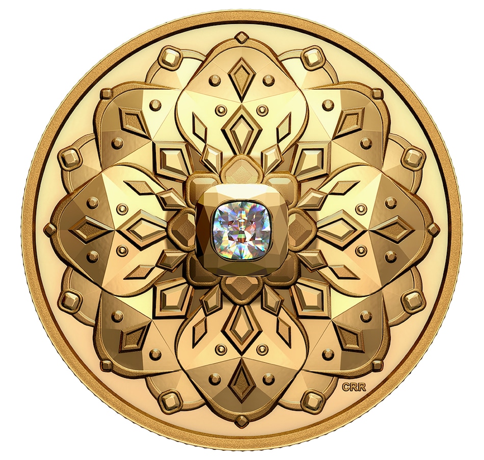 The reverse design by Chris and Rosina Reid is inspired by the 0.23-carat Forevermark Black Label cushion-cut diamond centrepiece. The diamond is one of the last to be extracted from the Victor Mine in Northern Ontario. The engraved arrangement is an artistic interpretation of the diamond's light performance and features rising layers of geometric shapes engraved in ultra high relief. The obverse features the effigy of Her Majesty Queen Elizabeth II by Susanna Blunt.