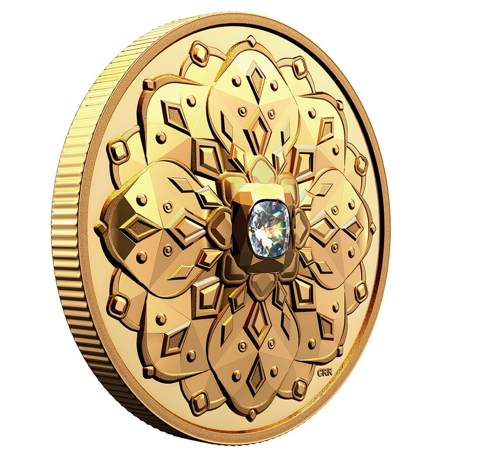 Resembling a pillow of pure sparkling light, a cushion-cut diamond features a rounded square shape that naturally evokes romantic images of yesteryear. That trend-defying, vintage charm is part of its appeal, but so too is its abundance of fire—in fact, no other shape rivals the intensity of a cushion-cut diamond's flashes of coloured light. That high fire is evident on this 99.99% pure gold coin's reverse, where ultra high relief engraving rises up to surround the 0.23-carat Forevermark Black Label cushion-cut diamond that inspired the geometric design.