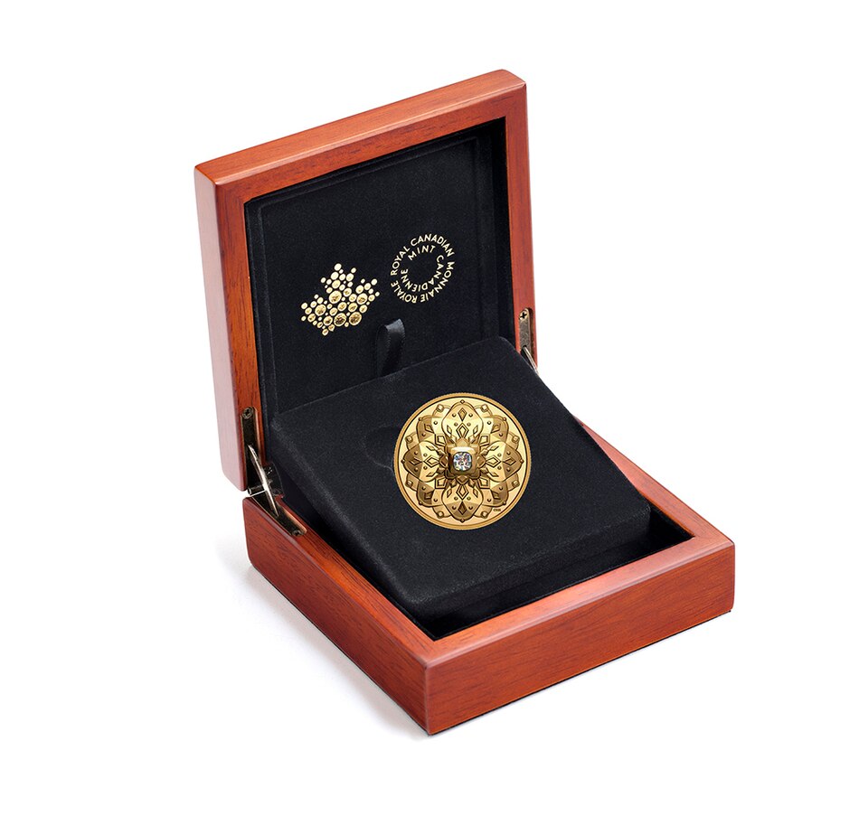 The coin comes in a wooden case packaged in a graphic beauty box, together with two serialized certificates of authenticity: one from the Royal Canadian Mint, and one for the diamond, provided by Crossworks Manufacturing.